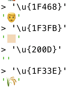 재밌는 사실은, 어떤 문자(character)들은 여러 코드 포인트들의 조합으로 구성되었다는 점입니다. 👨🏻🌾 여기 농부 아저씨 이모지를 예시로 들어보겠습니다. 이 농부를 표현하기 위해 필요한 유니코드 코드 포인트는 총 몇개일까요?