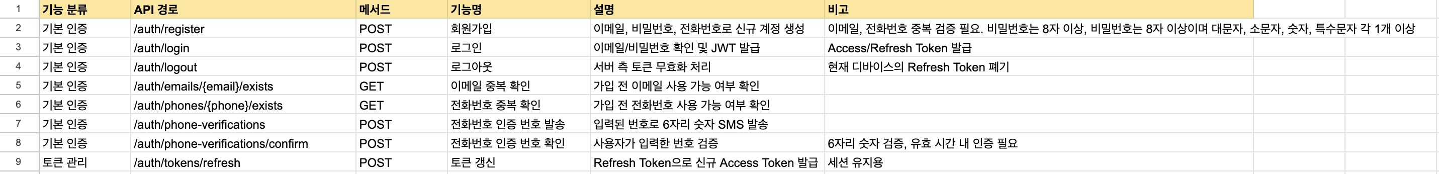 제미나이가 뽑아준 기능명세서 엑셀시트이다.