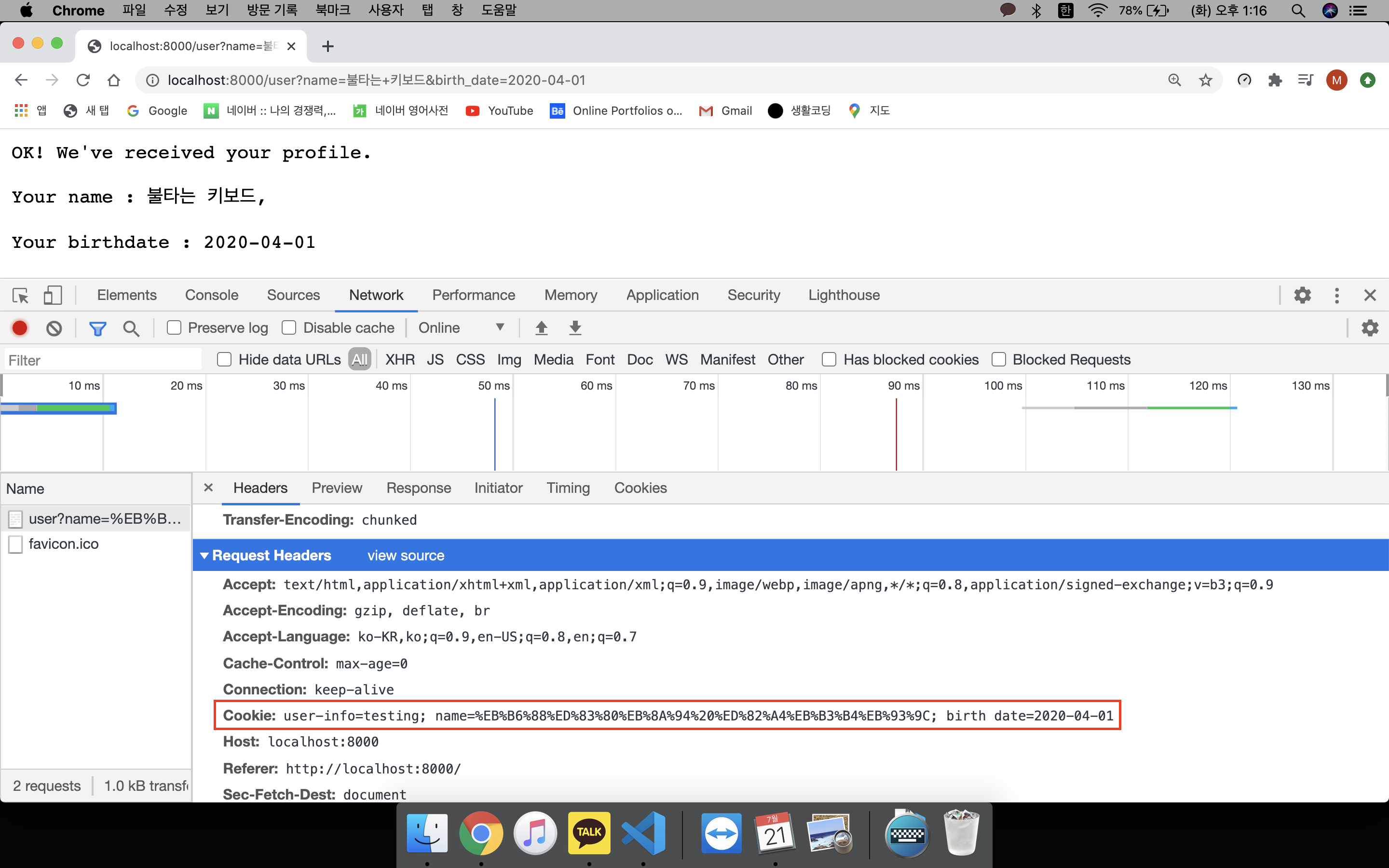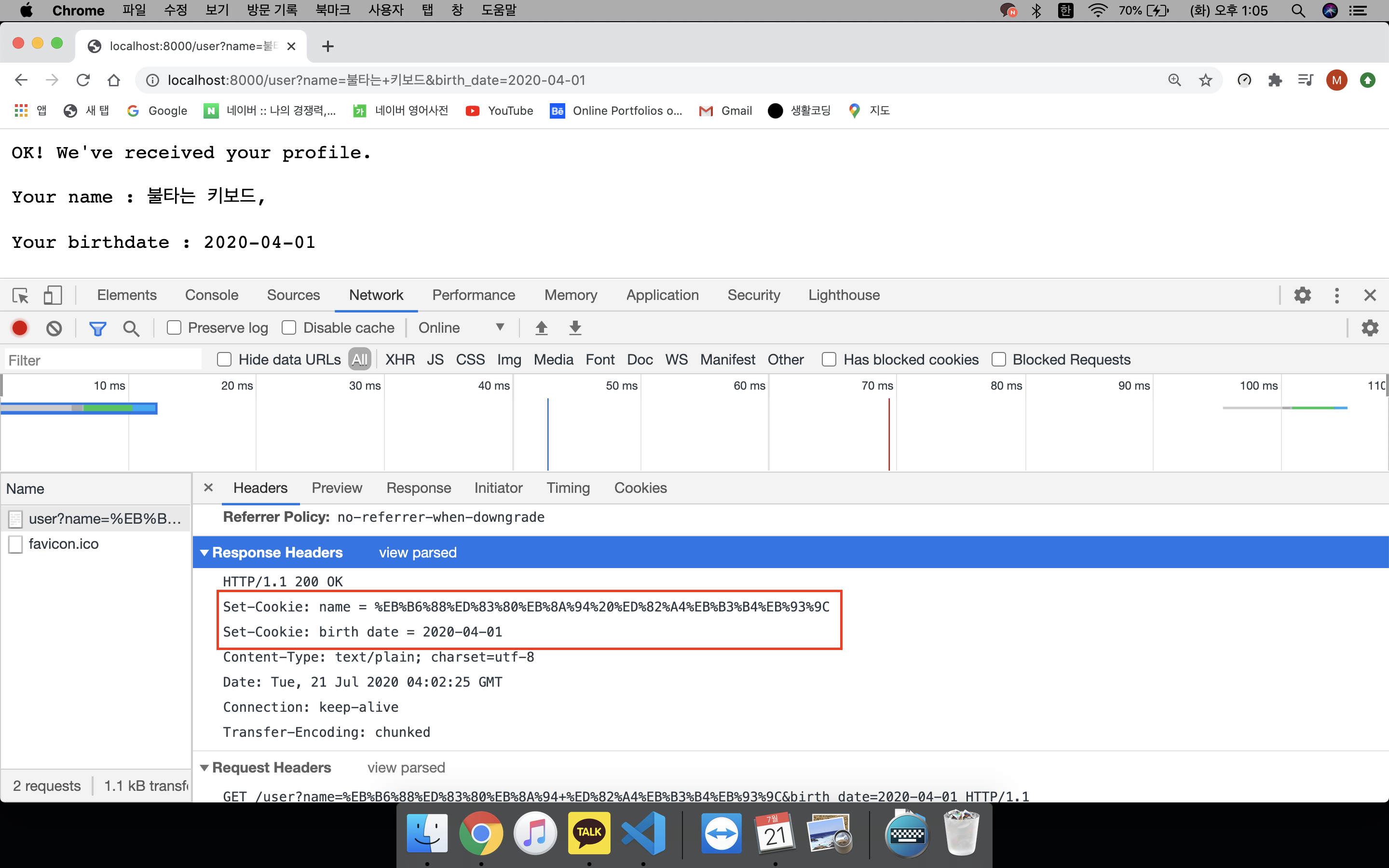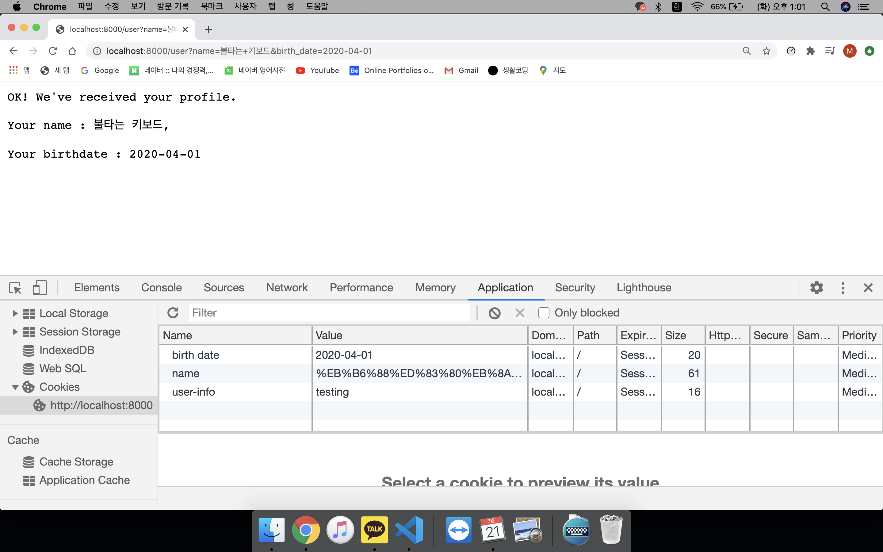 지난 part 1에서는 사용자의 이름과 생년월일 정보를 받았지만, 쿠키에는 이름만 등록을 했었습니다.