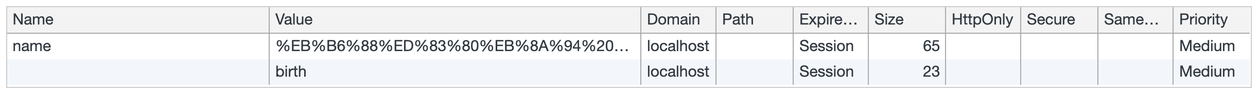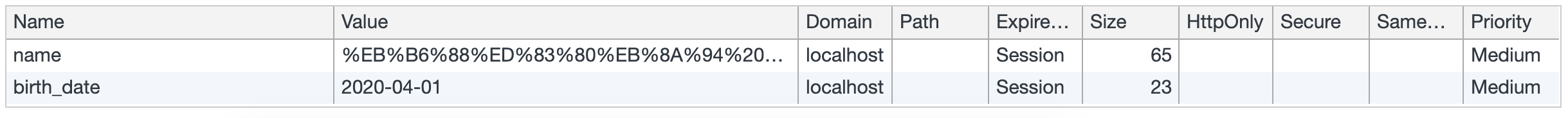 따라서 name 값이 필요로 하면 cookies.name, birthdate값이 필요로 하면 cookies.birth_date로 불러올 수 있습니다.