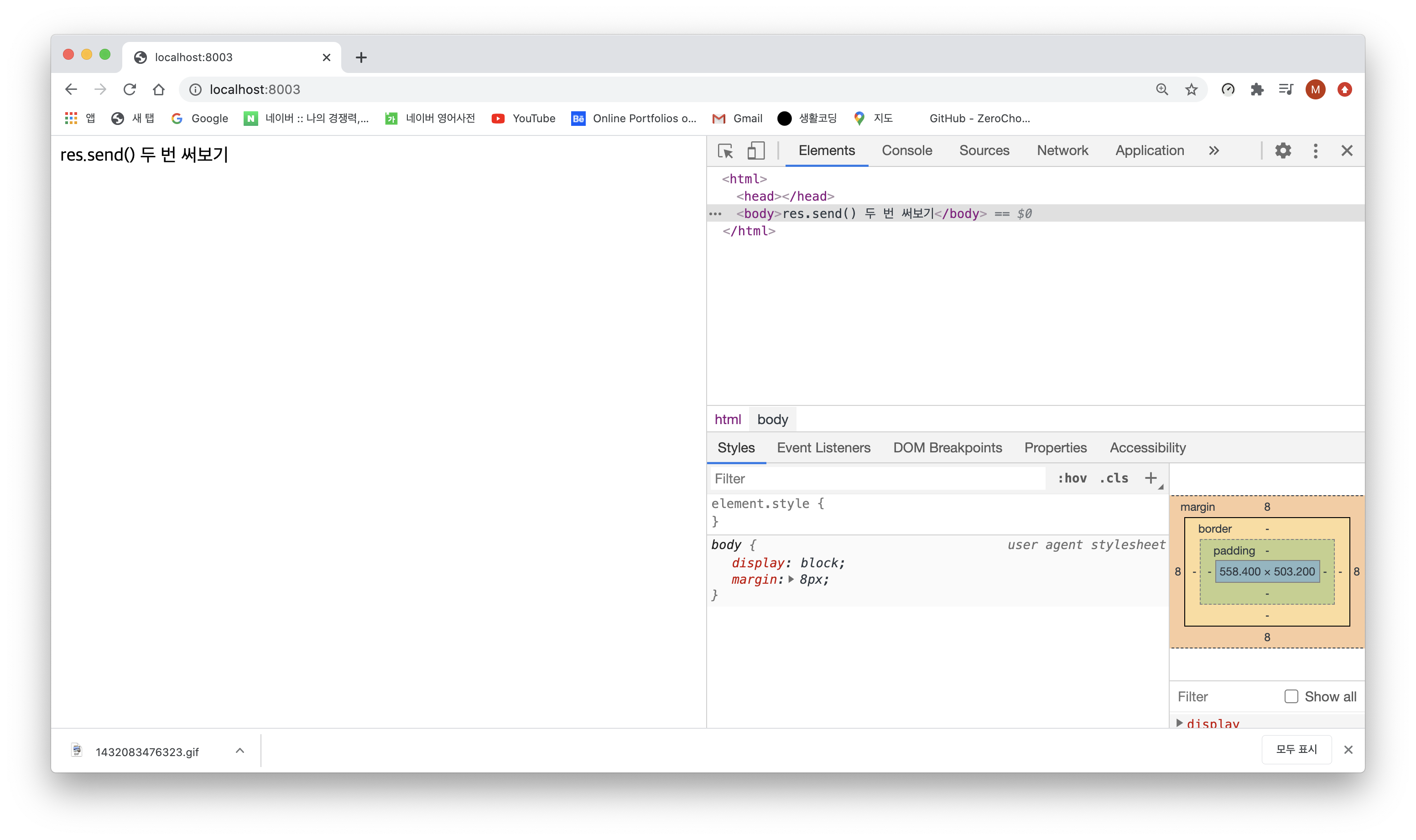아래처럼 res.send()를 두 번 적으면 가장 위에 있는 코드만 적용이 되고