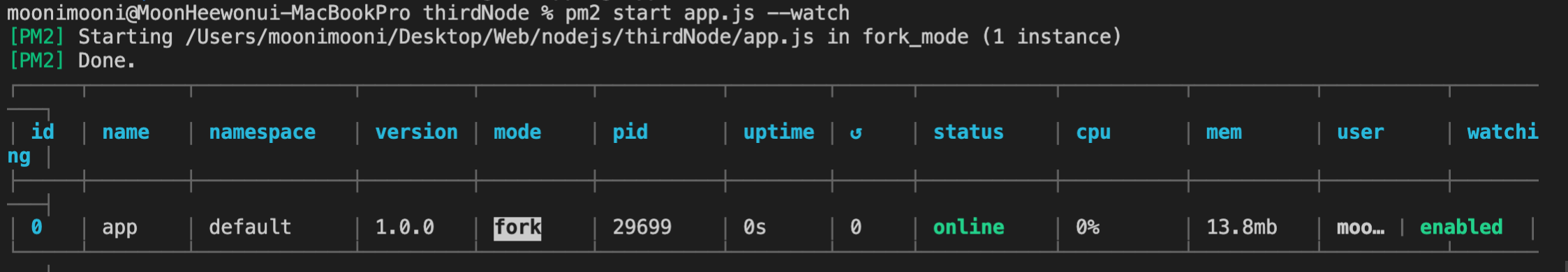 node app.js 로 실행 명령을 내려도 되지만 pm2를 다운받아 이렇게 이용하면