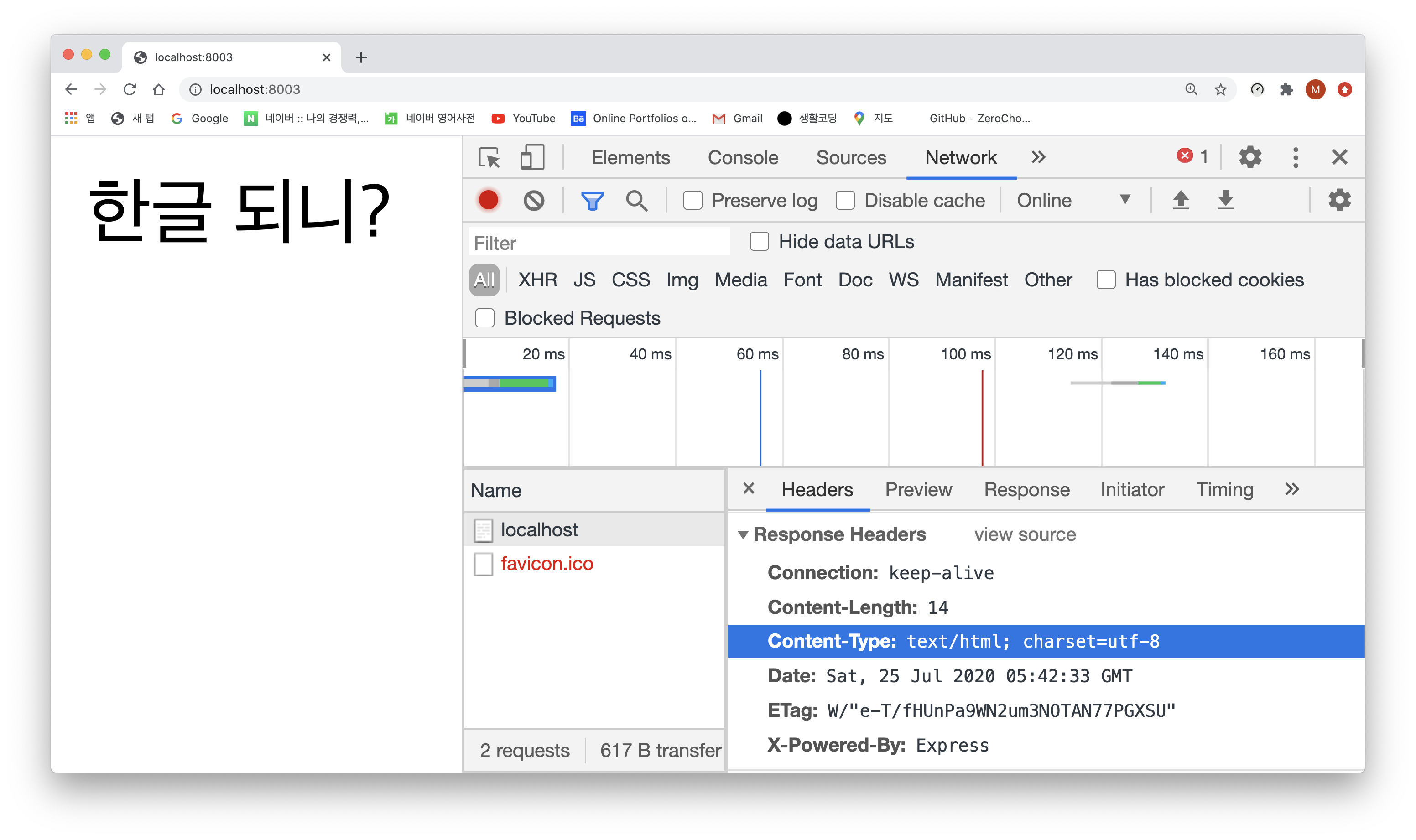 express를 사용하지 않았을 때는 res.writeHead() 부분에 한글 관련 인코딩 옵션을 넣어줬어야 했는데