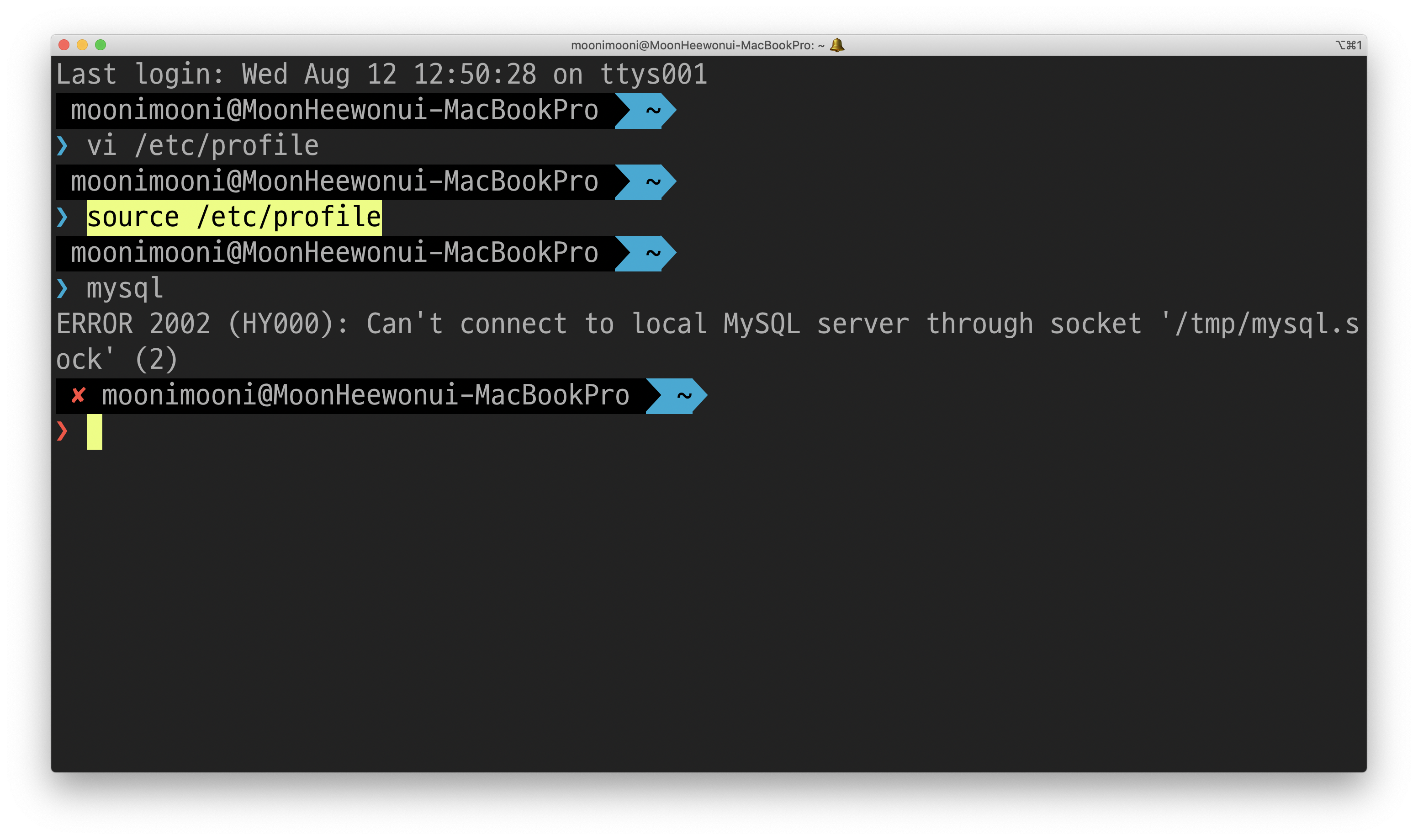 그 다음 바로 mysql 명령어를 찾으면 아까와는 다른 에러메세지가 뜹니다.