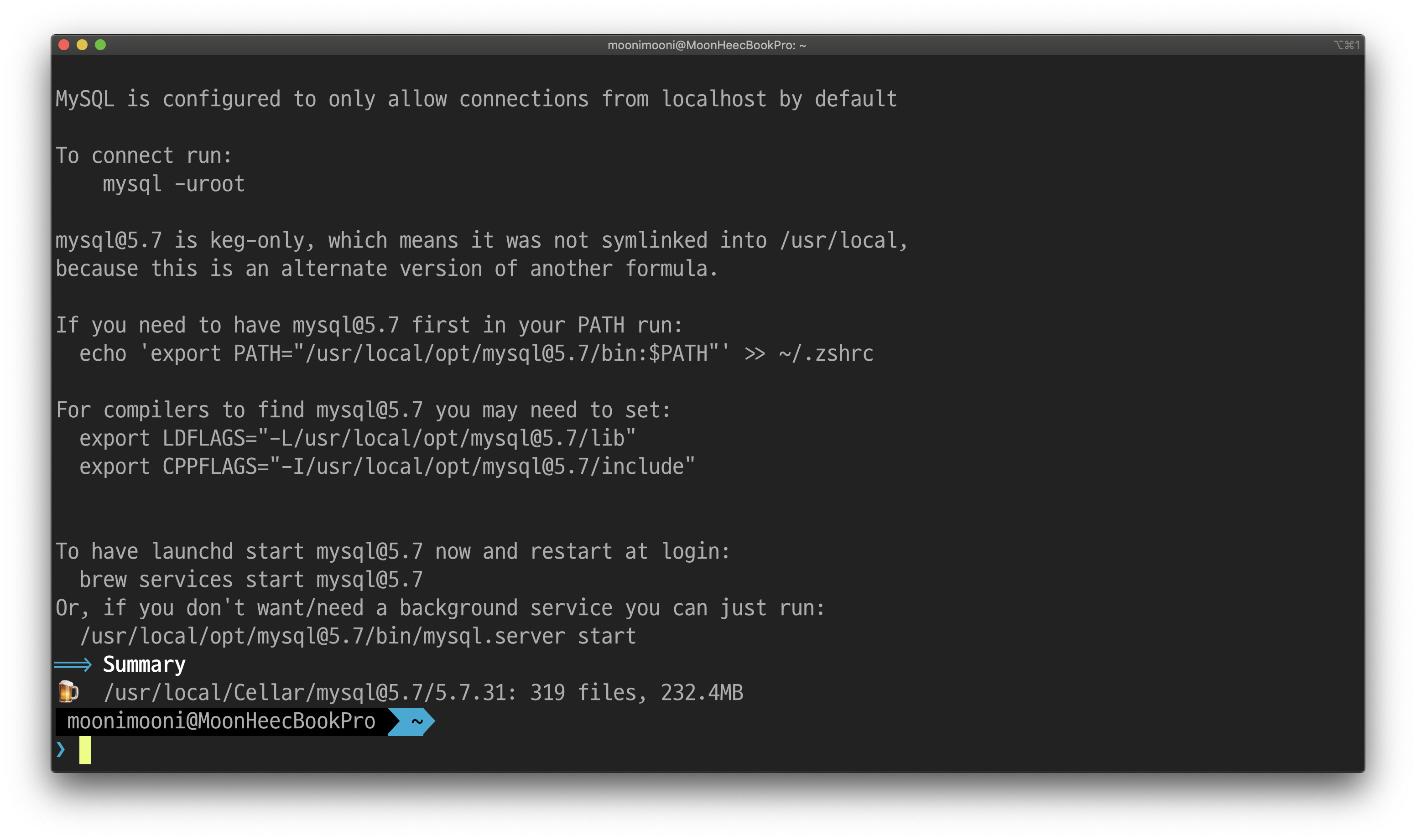 그런 다음, $ brew install mysql@5.7 을 입력하면 바로 설치를 진행합니다.