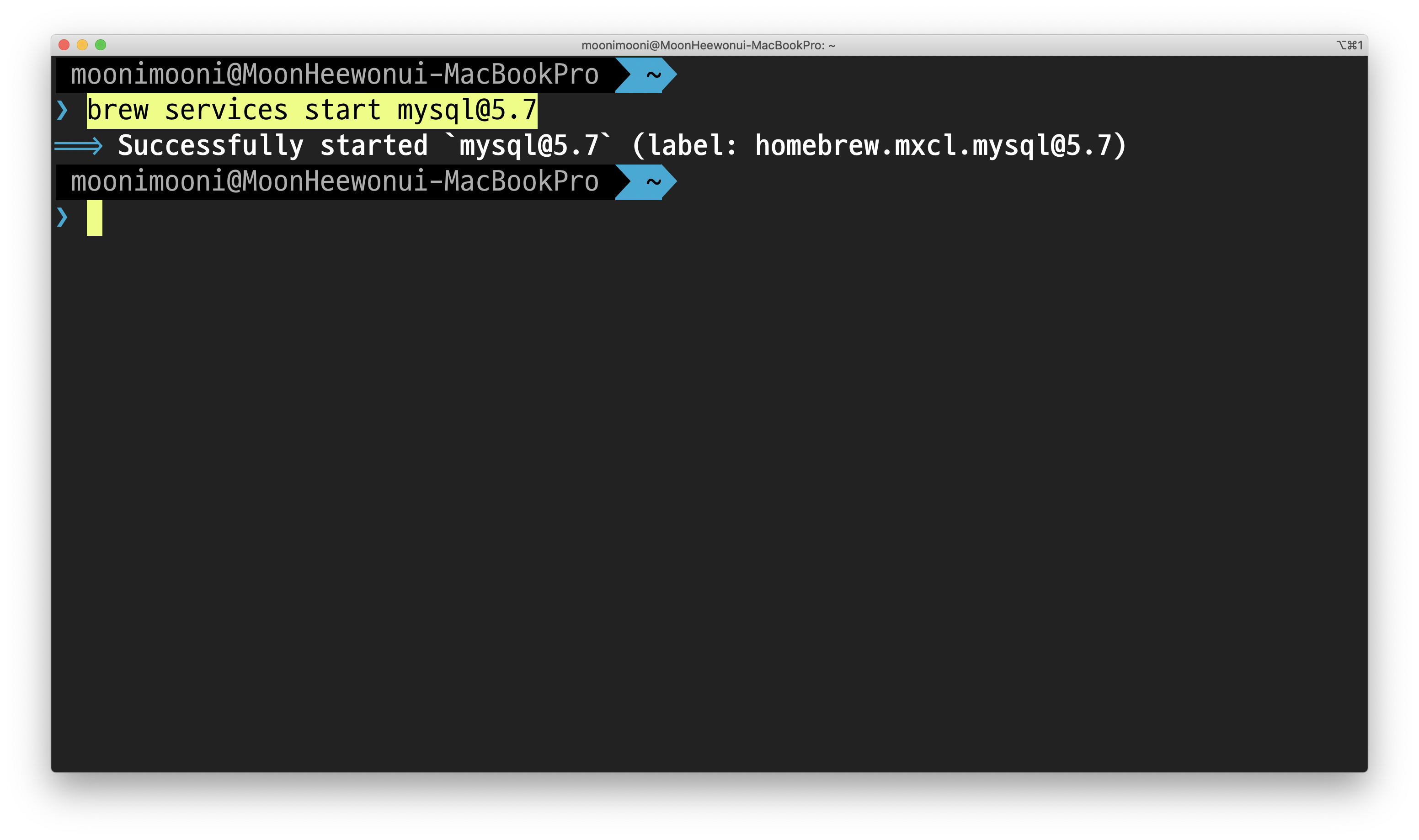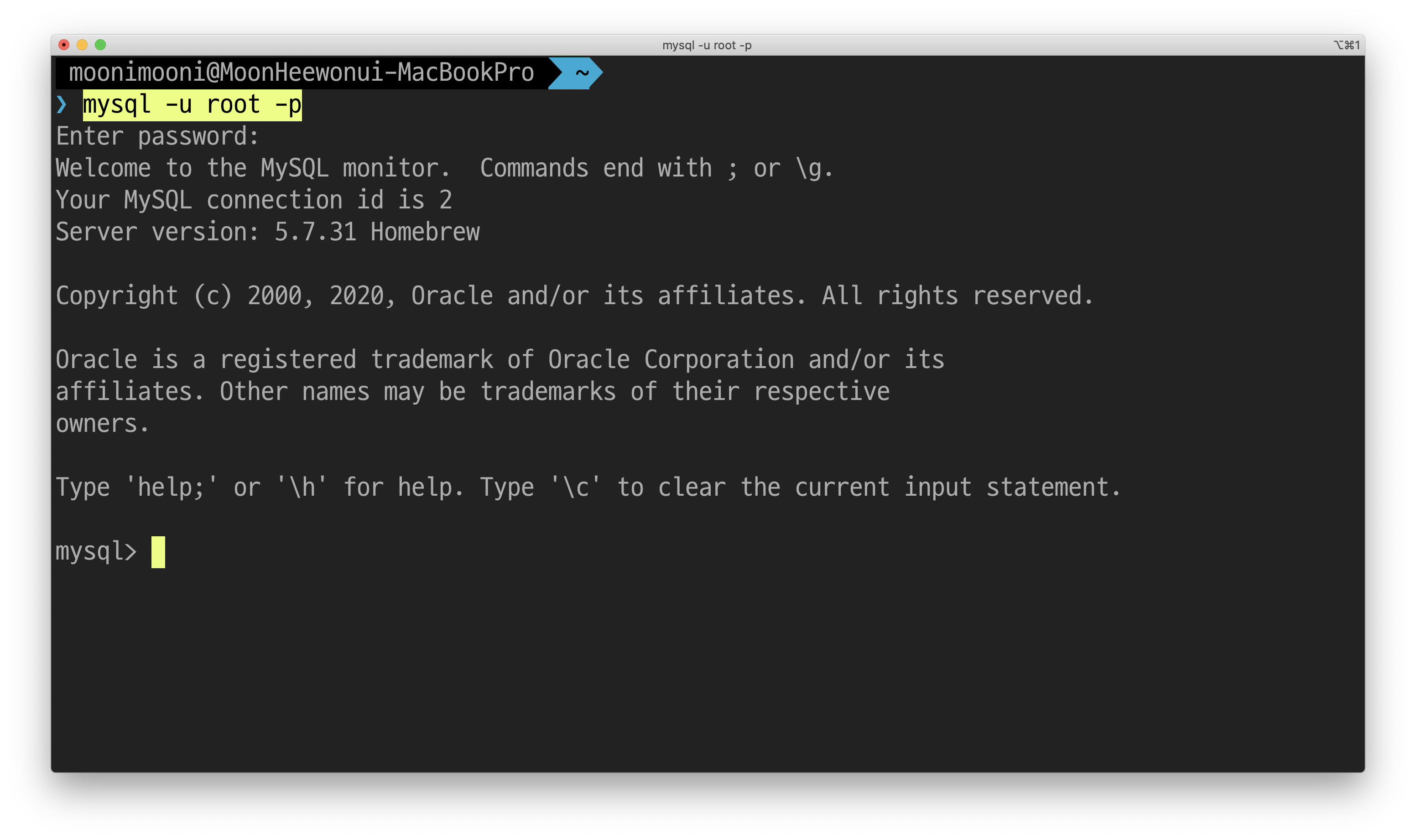 비밀번호 설정이 완료되었다면 아래 명령어로 mysql을 실행합니다.