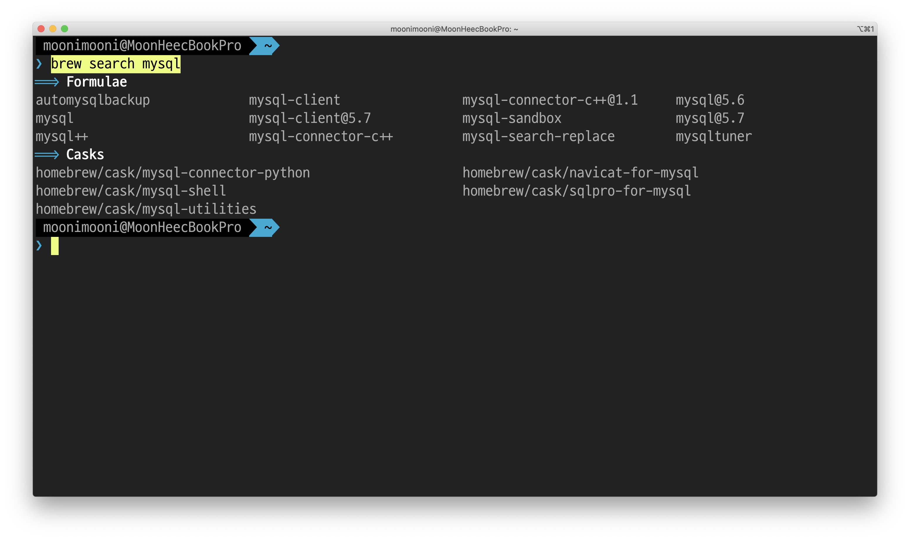 $ brew search mysql 을 실행하면 mysql과 관련된 다양한 패키지들이 나열됩니다.