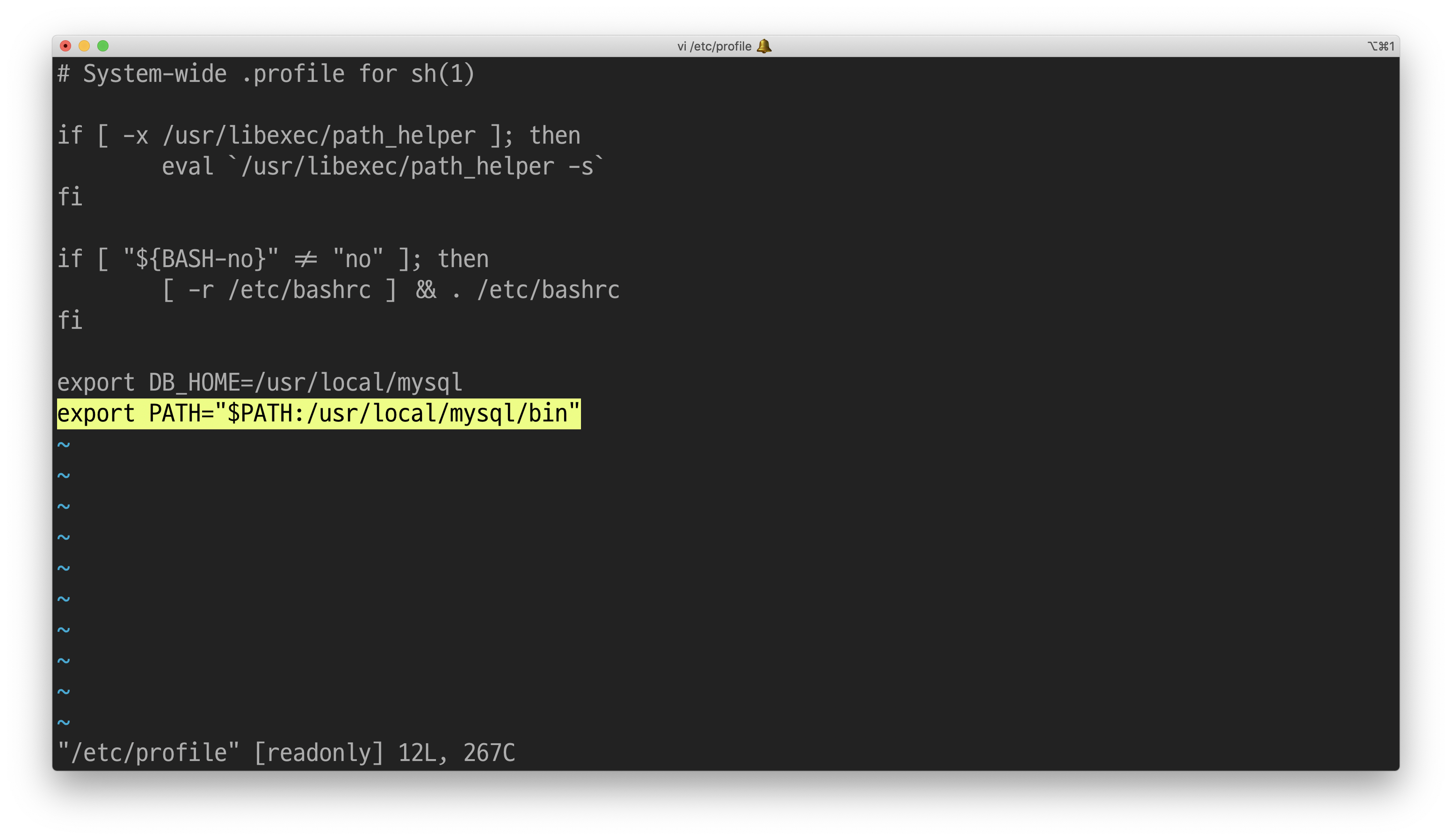 export PATH="$PATH:/usr/local/mysql/bin" 를 추가해줍니다.