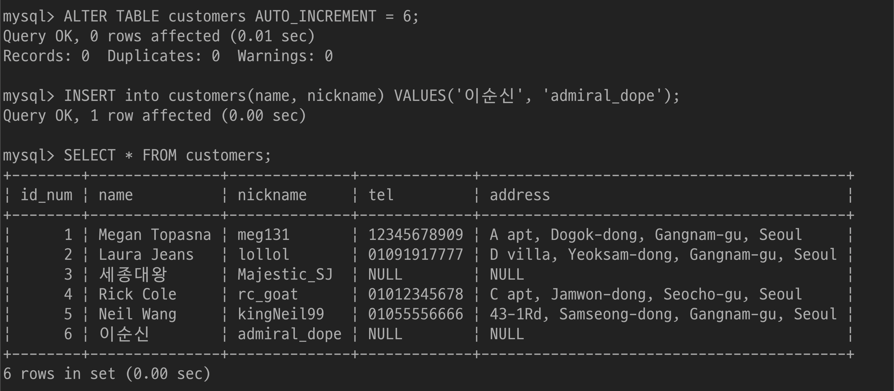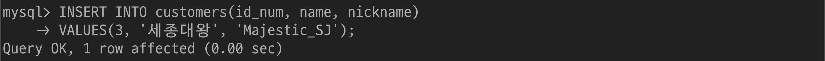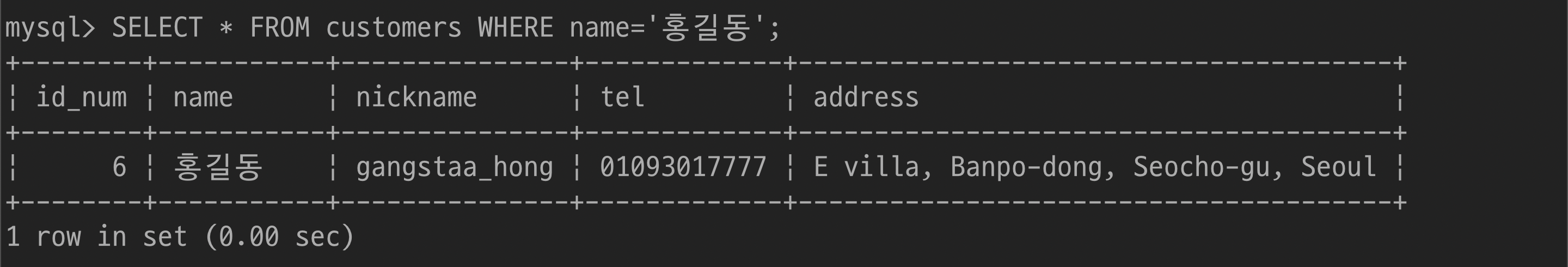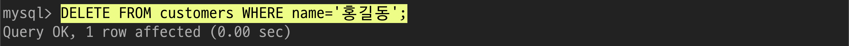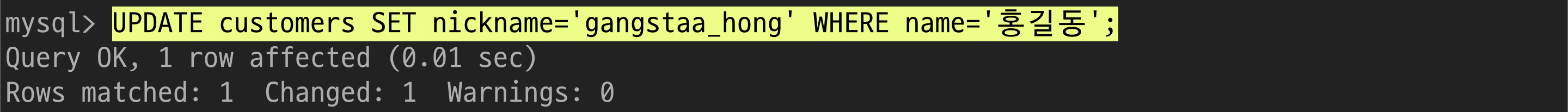 $ UPDATE customers SET nickname='gangstaa_hong' WHERE name='홍길동';