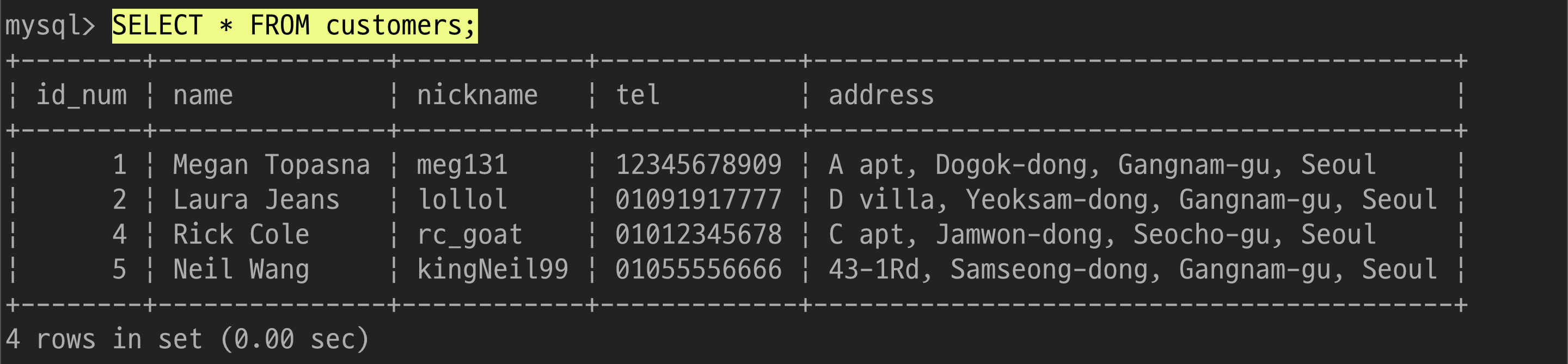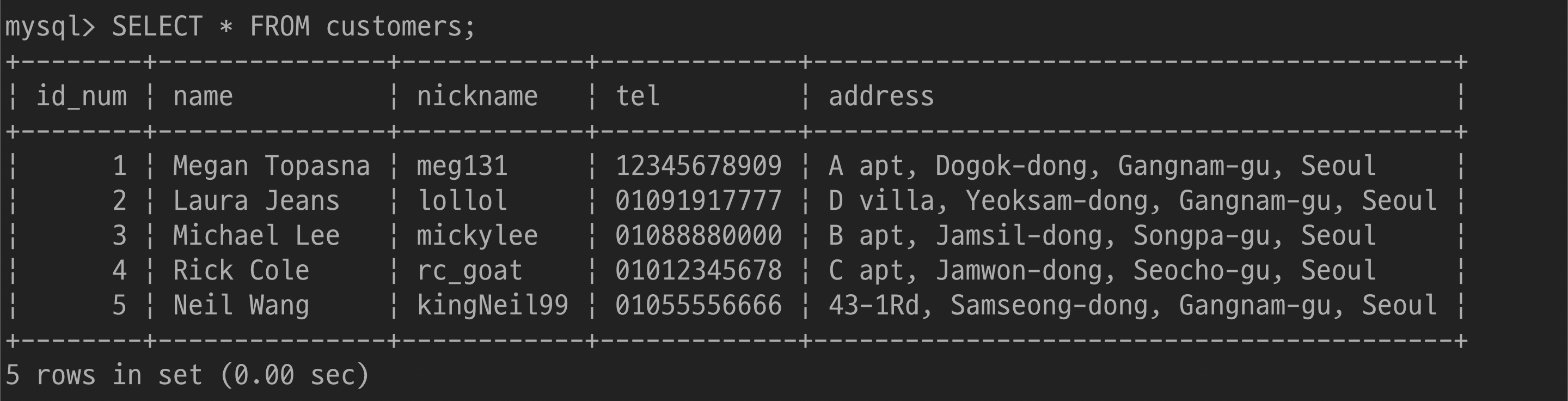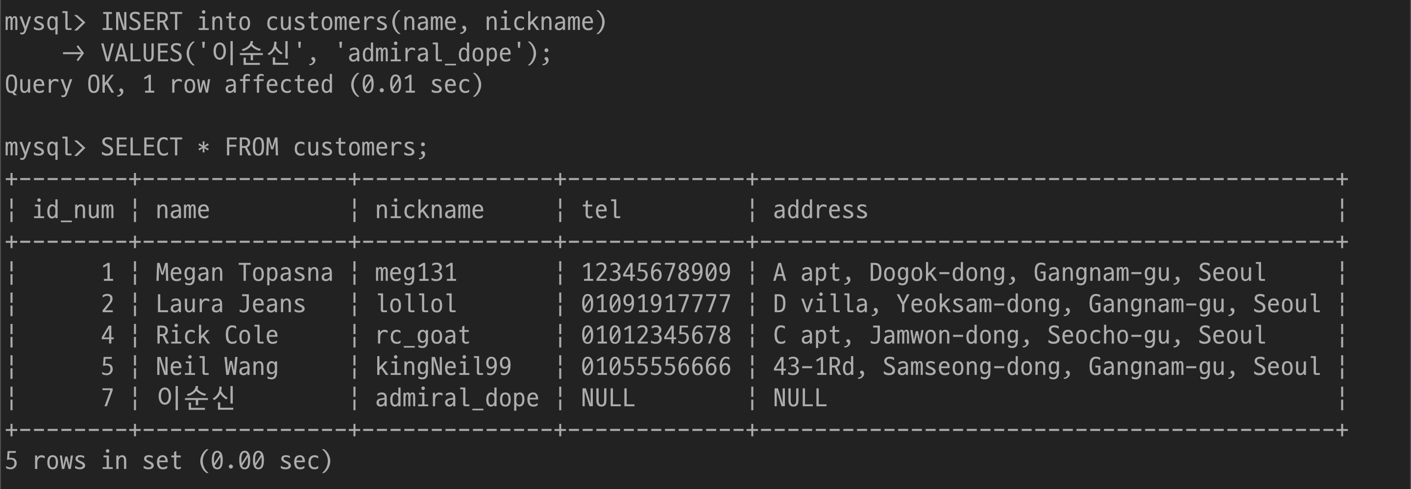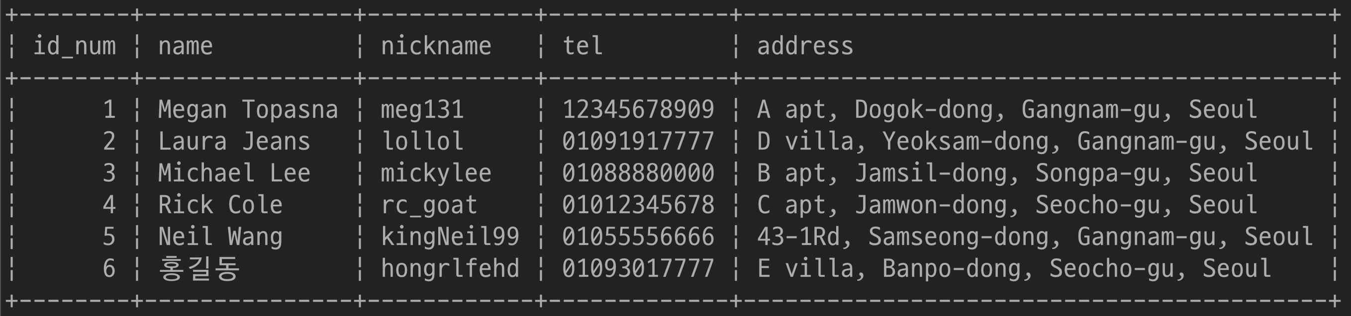 $ UPDATE customers SET nickname='gangstaa_hong' WHERE name='홍길동';