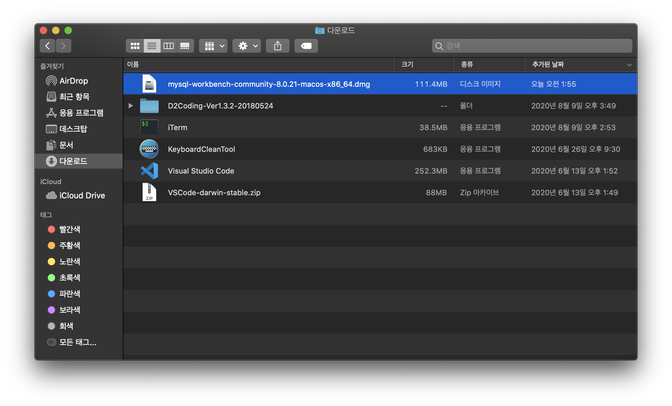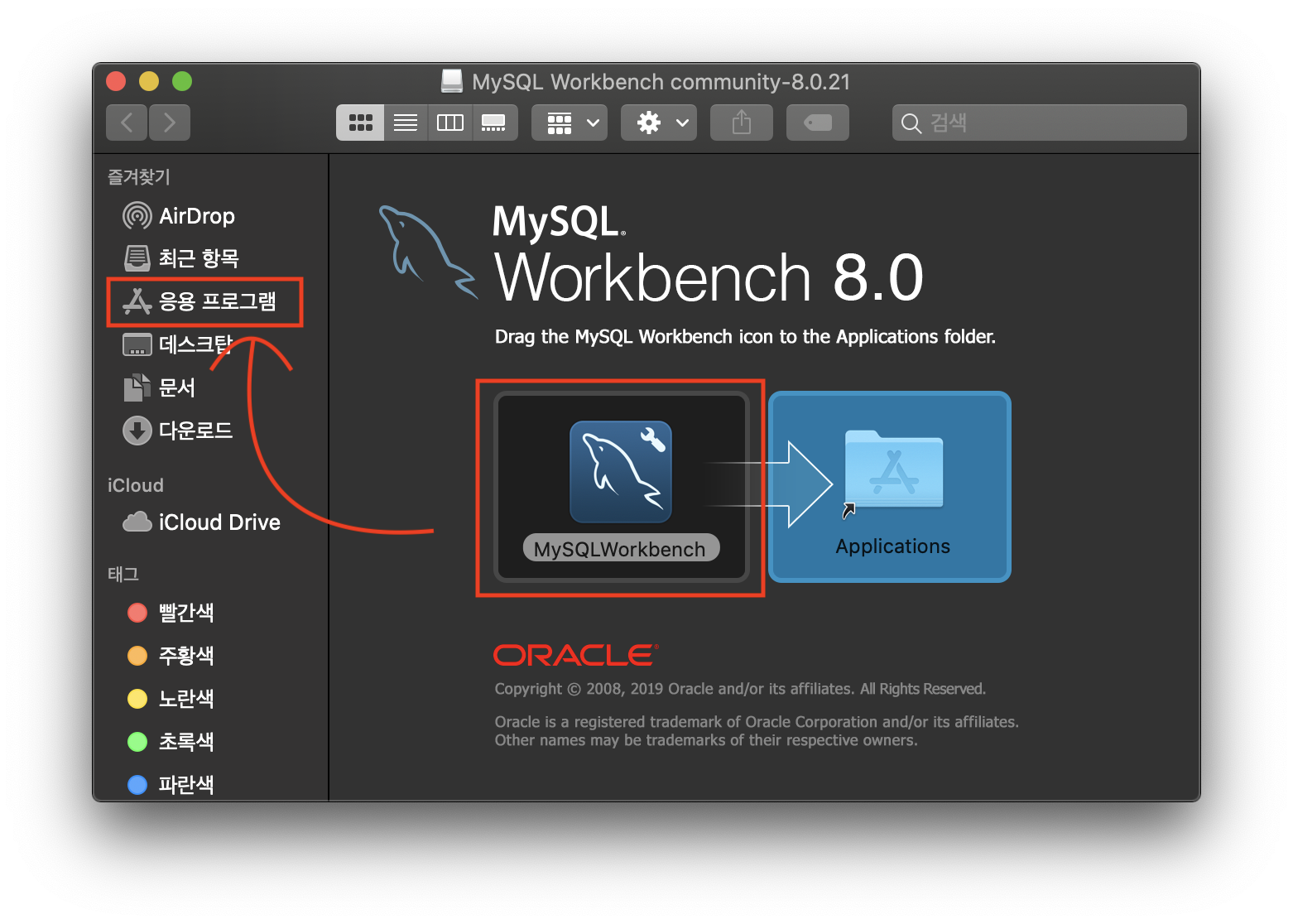 그럼 아래와 같은 화면이 뜨는데 MySQLWorkbench 아이콘을 응용 프로그램으로 드래그 앤 드롭합니다.