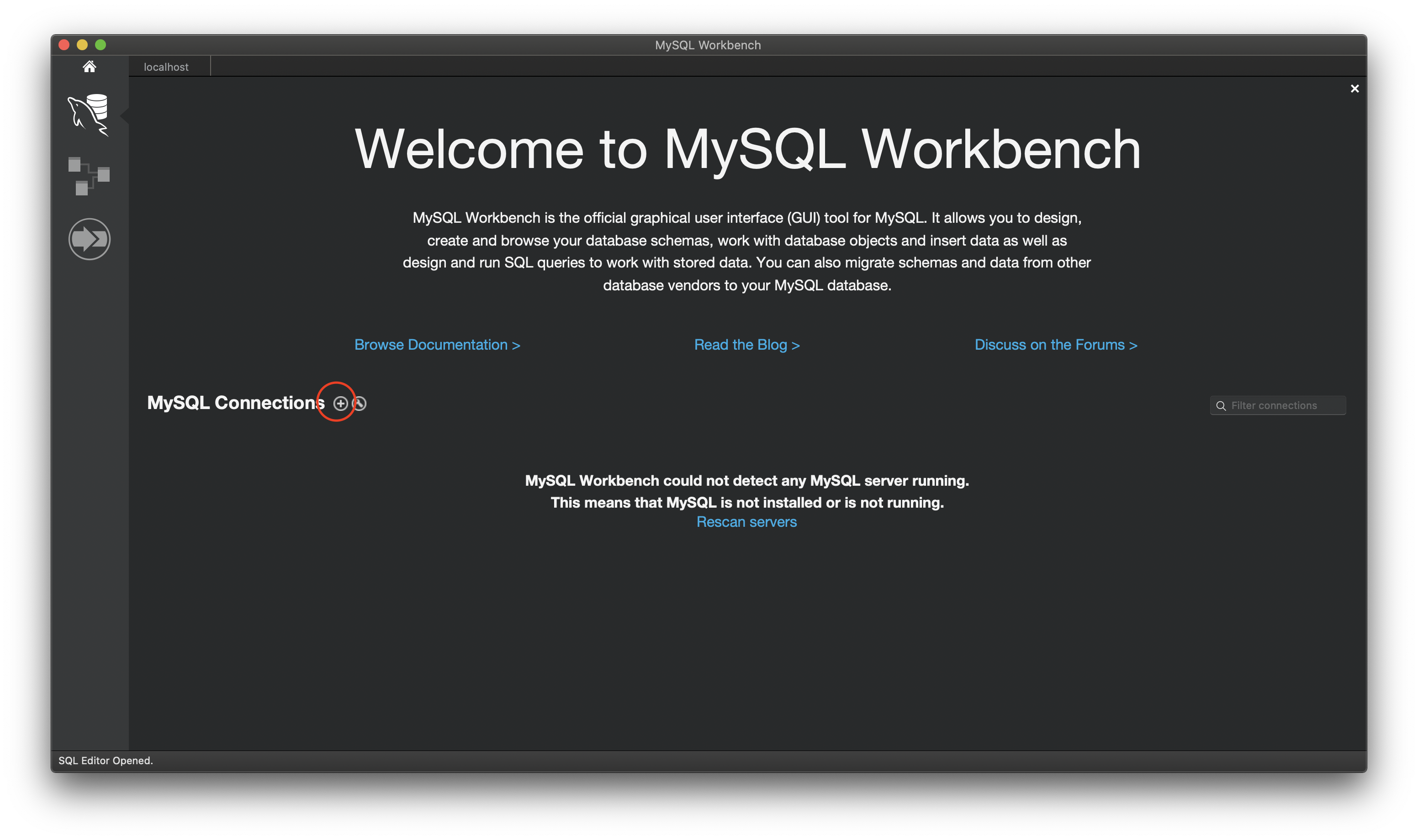 MySQL Connections에서 +를 눌러 서버를 생성합니다.