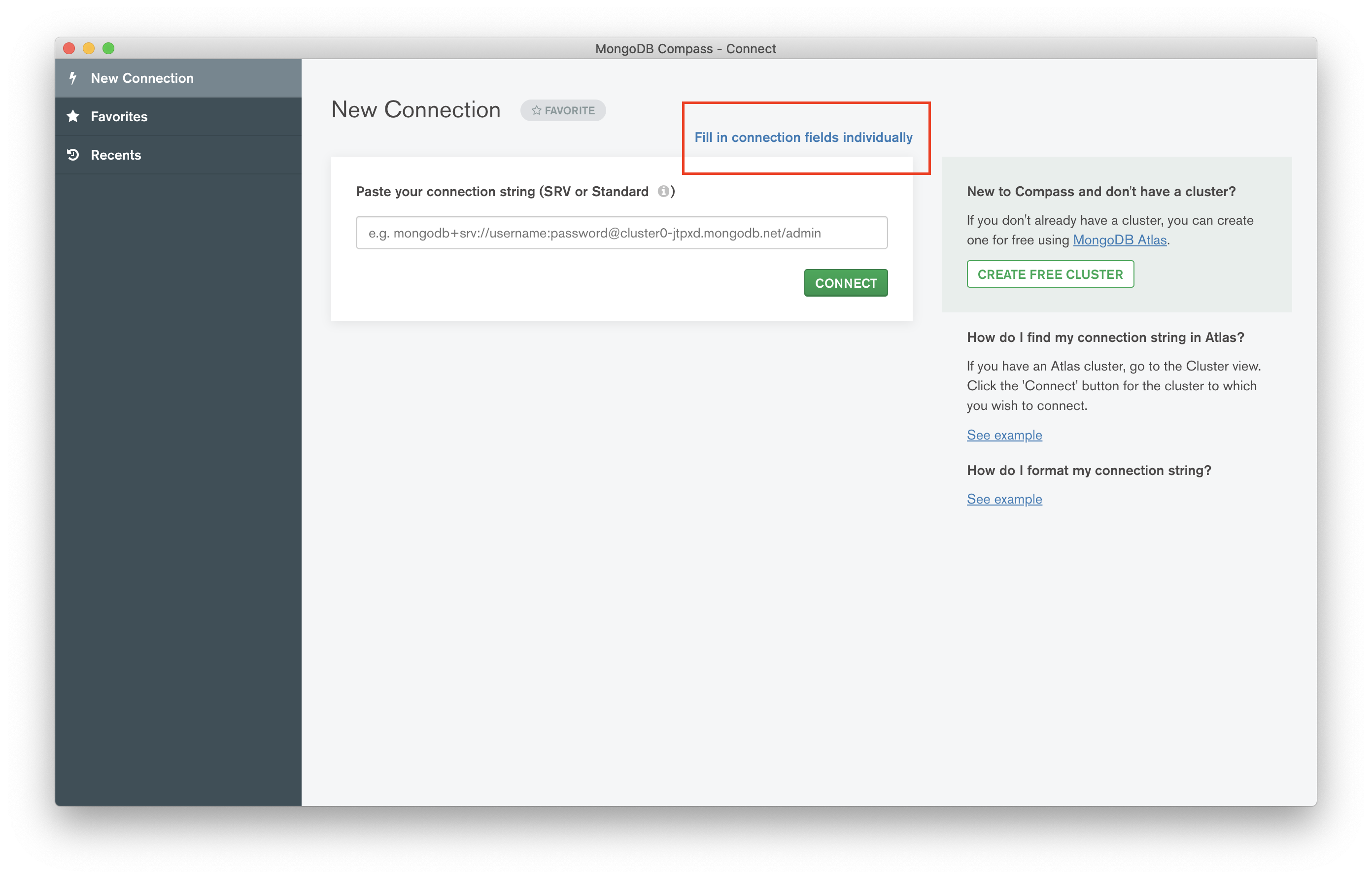 이전 버전들의 화면을 보고 싶다면 Fill in connection fields individually를 누르세요.