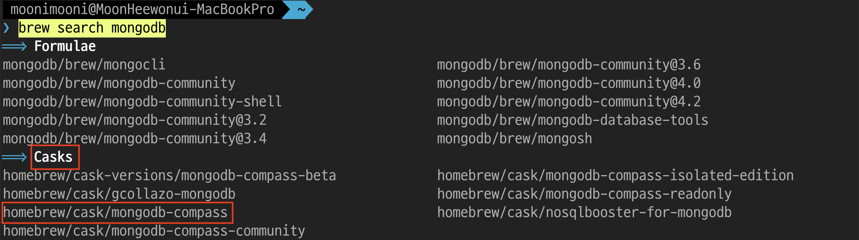 mongodb-compass 또한 Casks 목록에 포함되어 있습니다.
