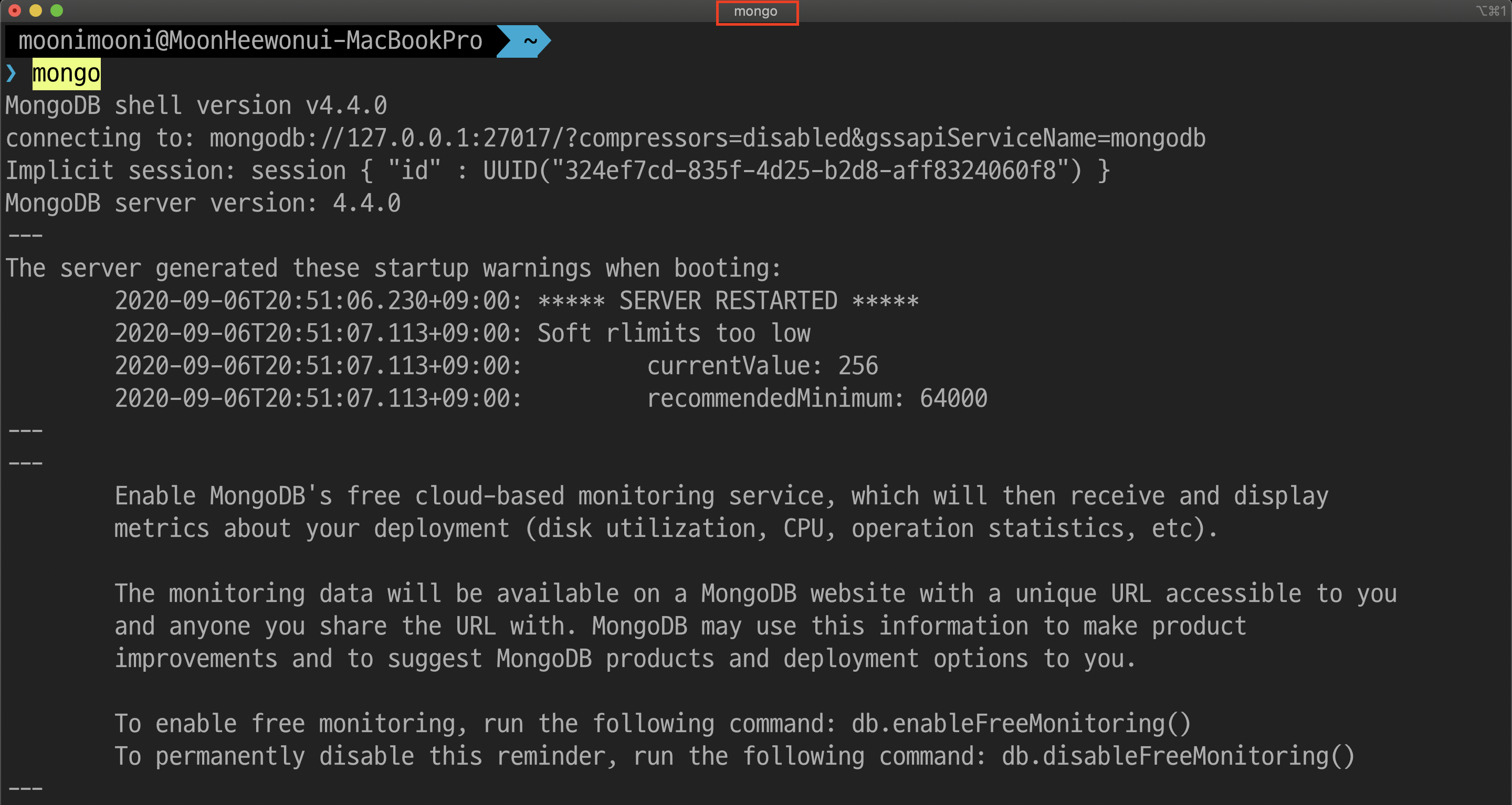 설치가 끝난 후 mongodb 실행 커맨드를 알려주는데