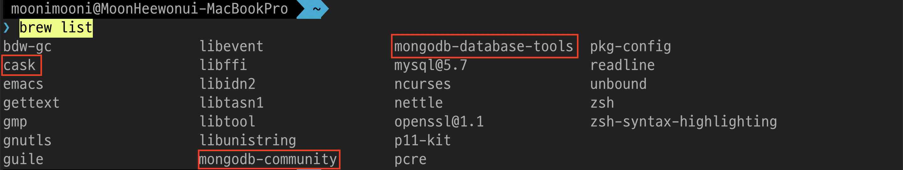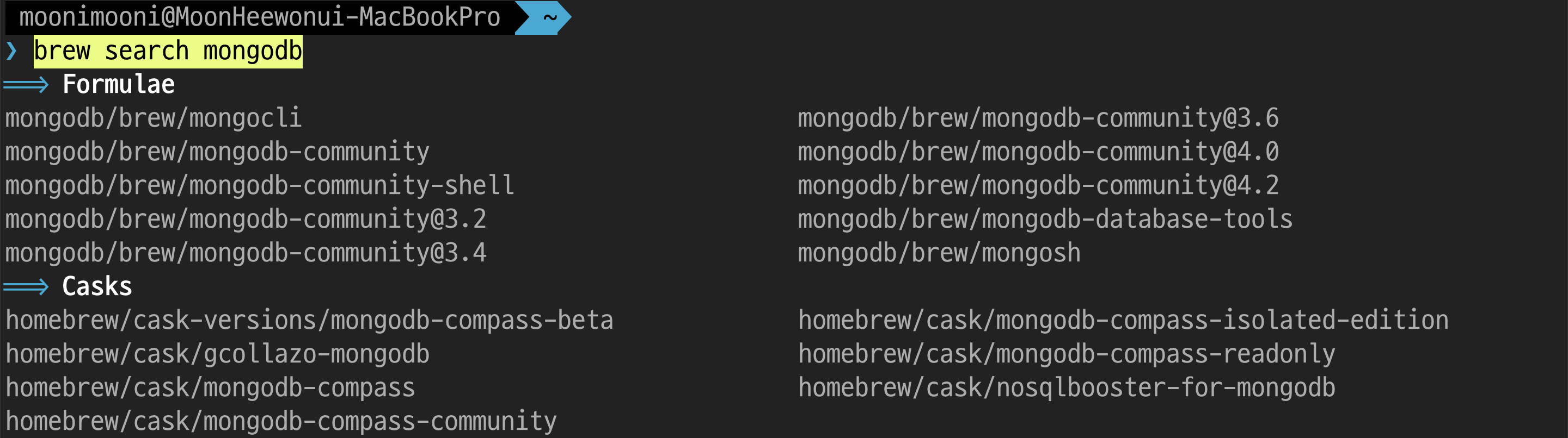 $ brew search mongodb를 통해 설치할 수 있는 mongodb 종류를 찾습니다.