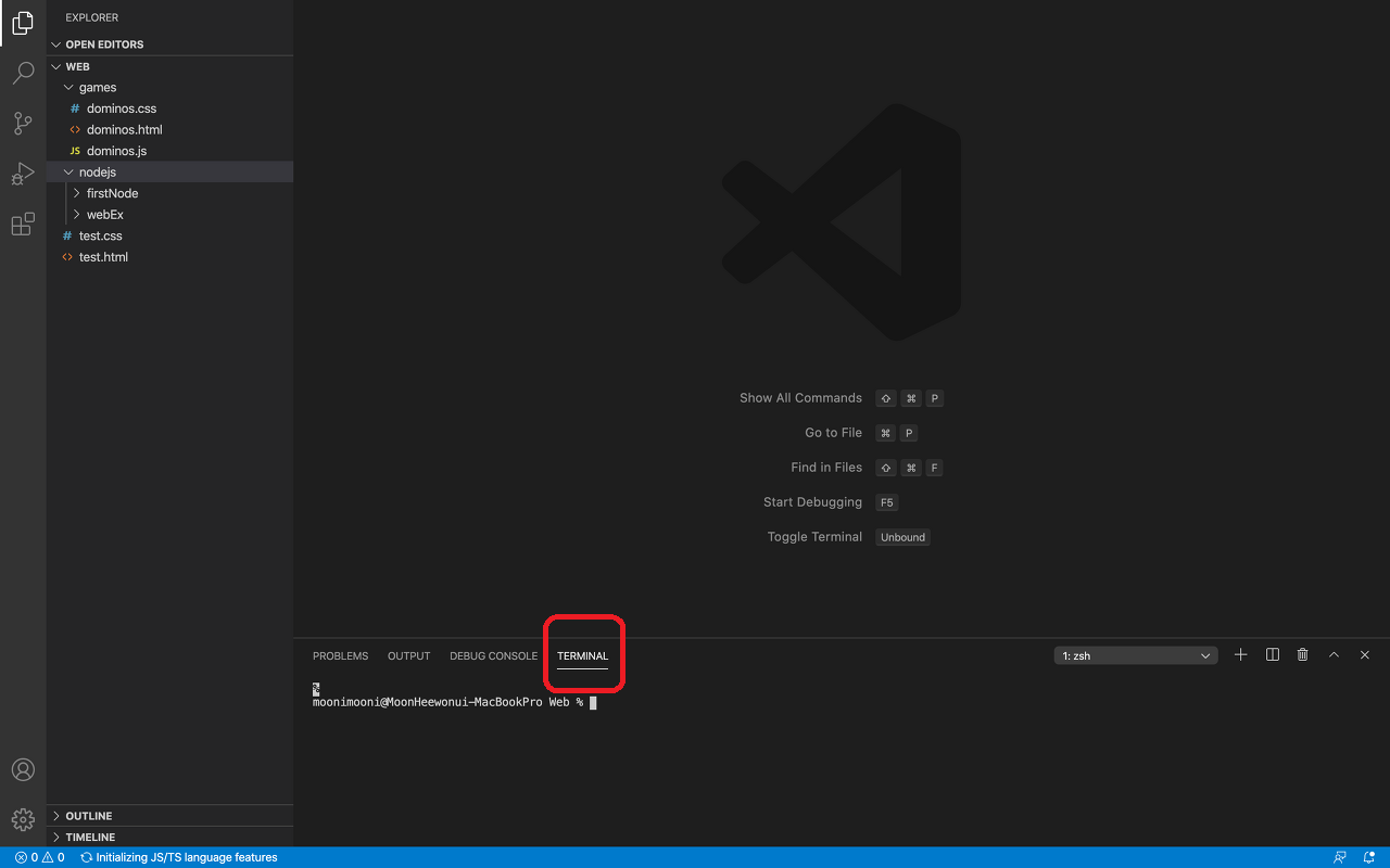 vs code 프로그램을 실행하면 하단에 콘솔창이 나타난다. 그 중 맨 오른쪽에 terminal이 있는 걸 볼 수 있다.