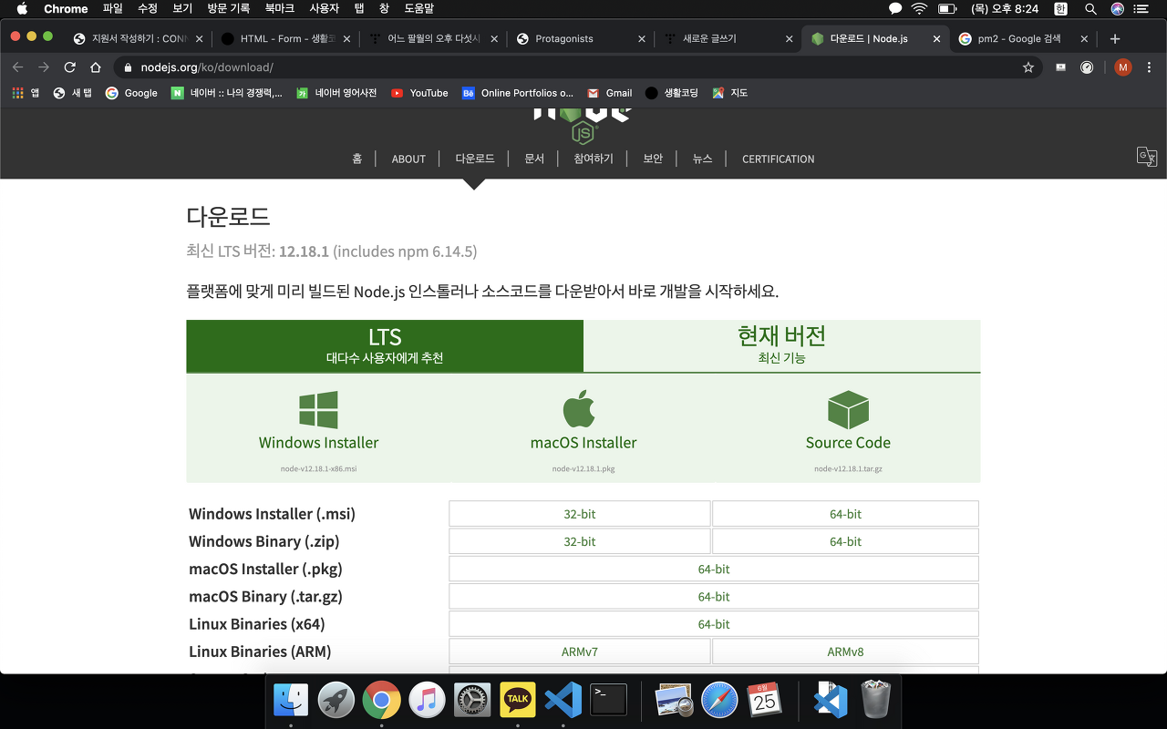 node가 처음이라면 LTS(long term support)버젼을 다운받도록 한다.