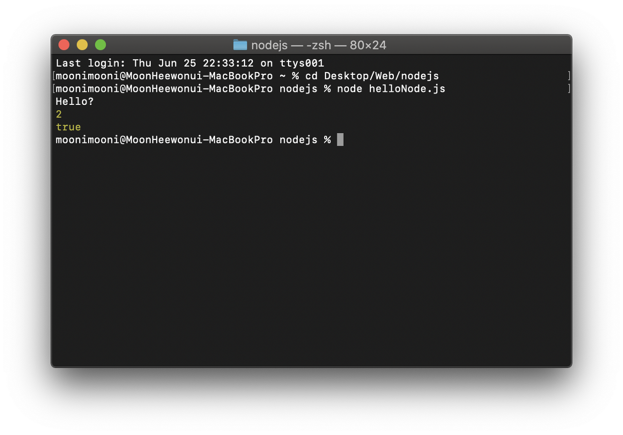 그리고 실행시킬 파일을 불러오기 위해 node helloNode.js라는 명령어를 친다.