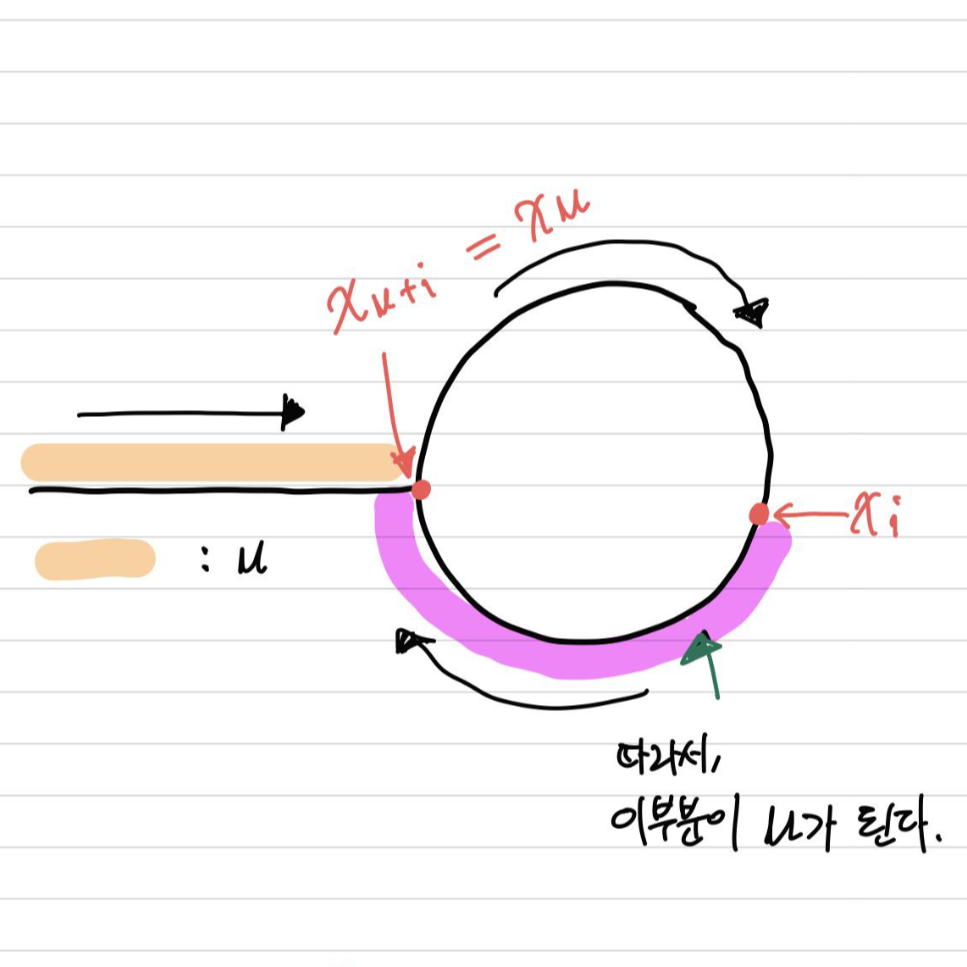 y = 𝓍𝑖와 𝓍μ 사이의 거리 (즉, 사이클 시작점에서부터 토끼와 거북이가 만난 지점까지의 길이)