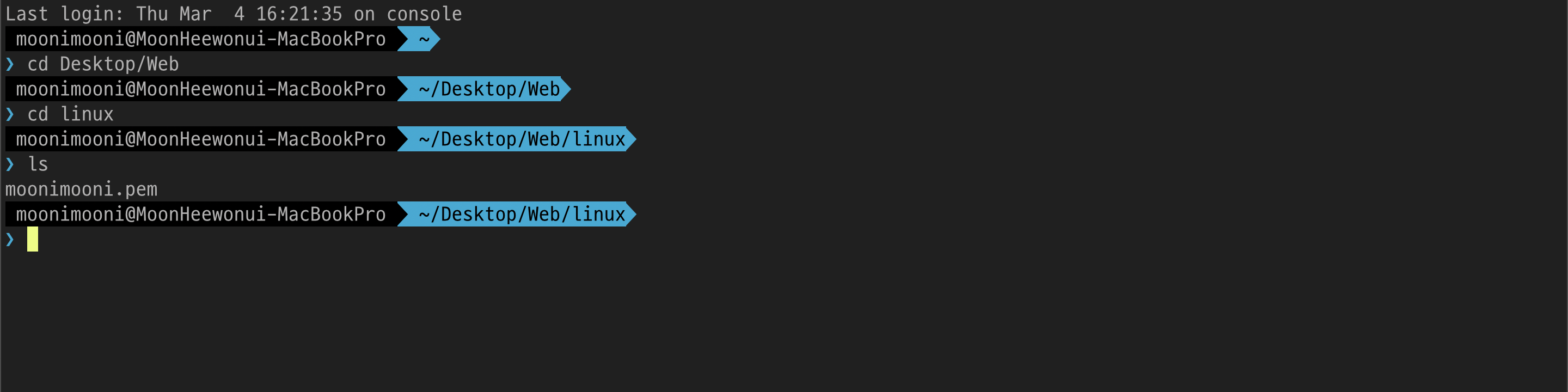 우선 터미널에서 나의 보안키가 등록되어 있는 디렉토리로 이동하였습니다.
