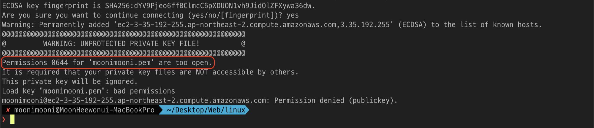 접속 명령어를 입력해보았는데 Permissions are too open 이라며 거부당했습니다.