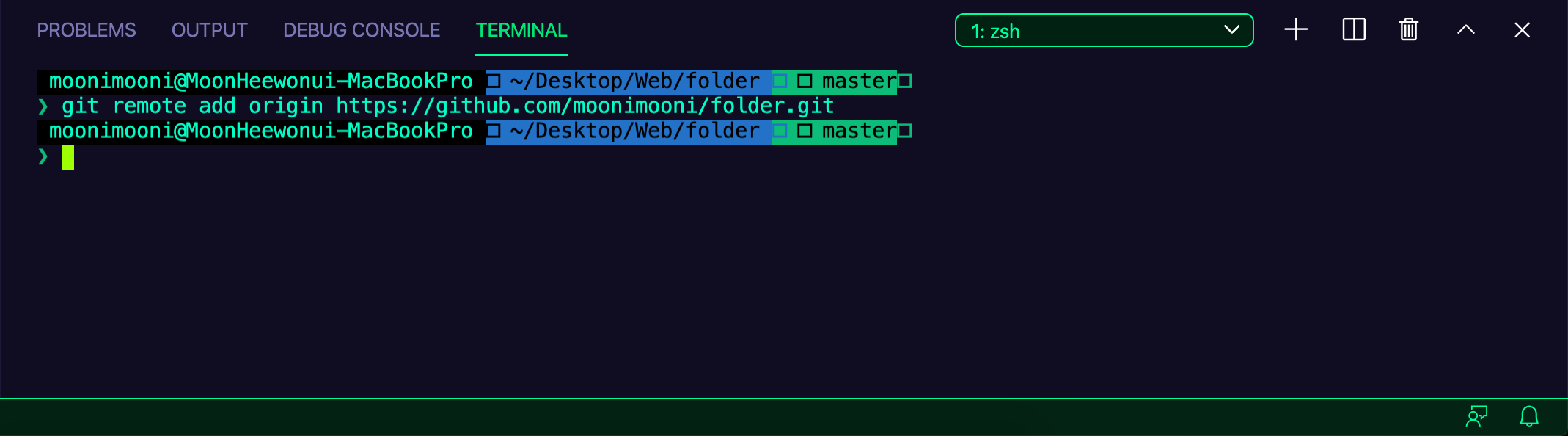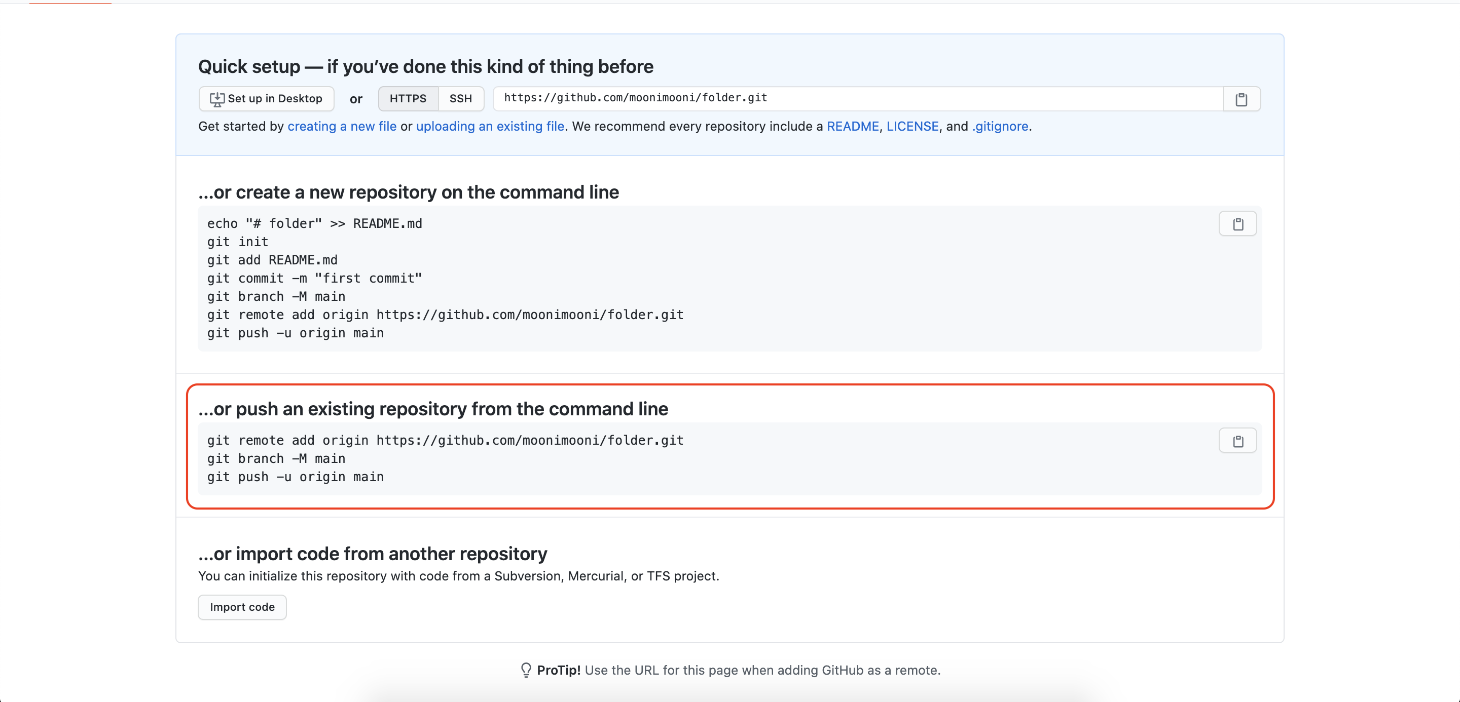 안내되어 있는 명령어 중 git remote add origin ~ 부분을 그대로 복사해 씁니다.