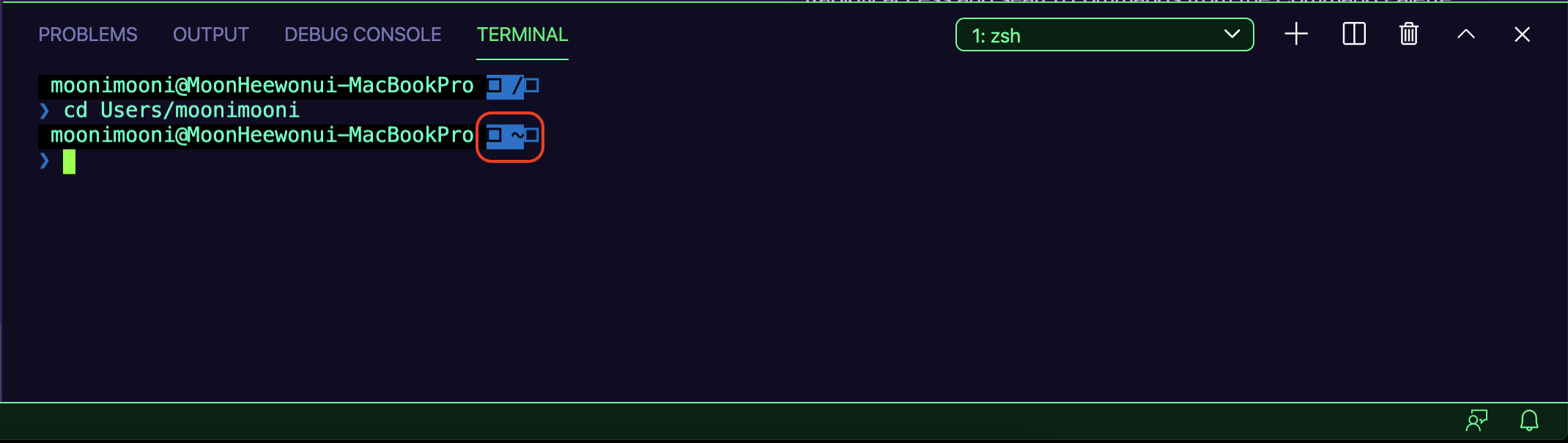 directory에 ~ (물결표)가 표시된다면 root 디렉토리에 있는 것입니다.