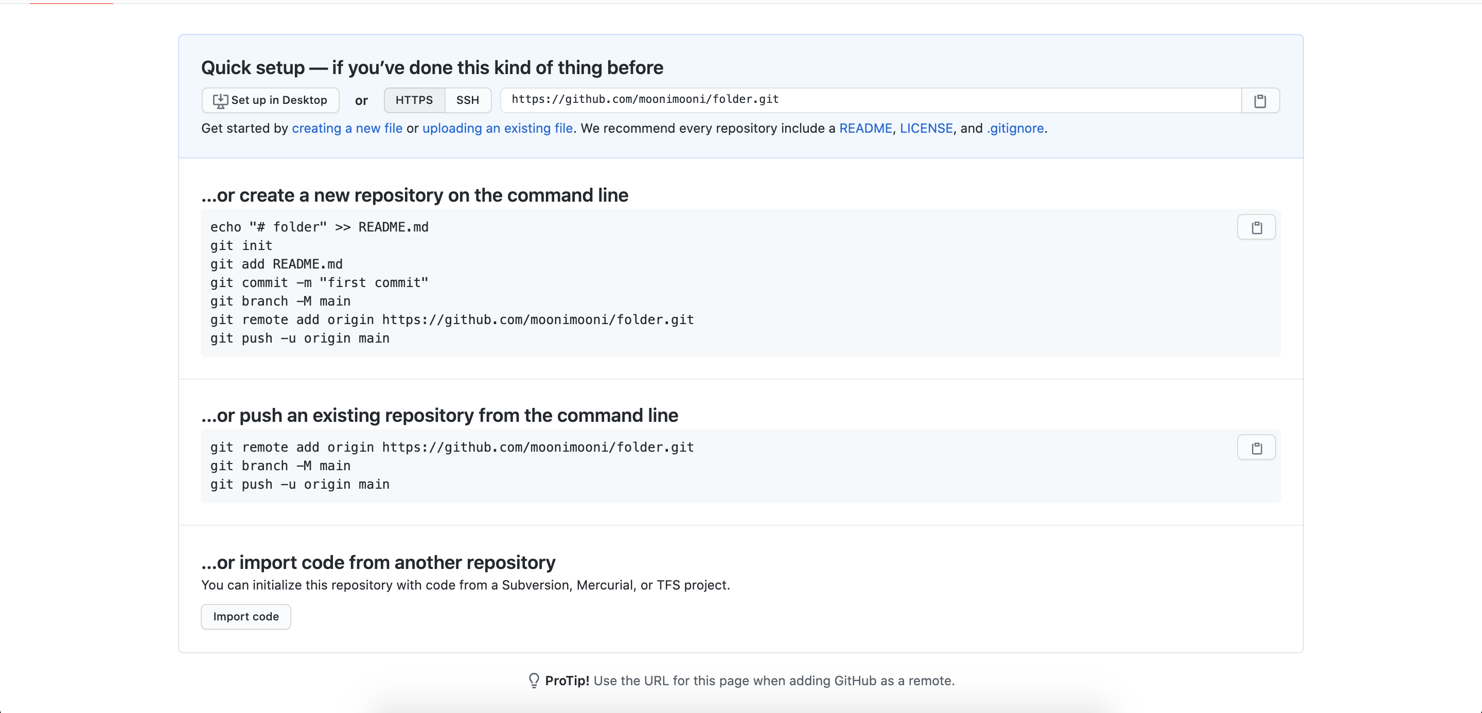 github 페이지에서 repository를 처음 만들었을때 페이지를 다시 봅시다.