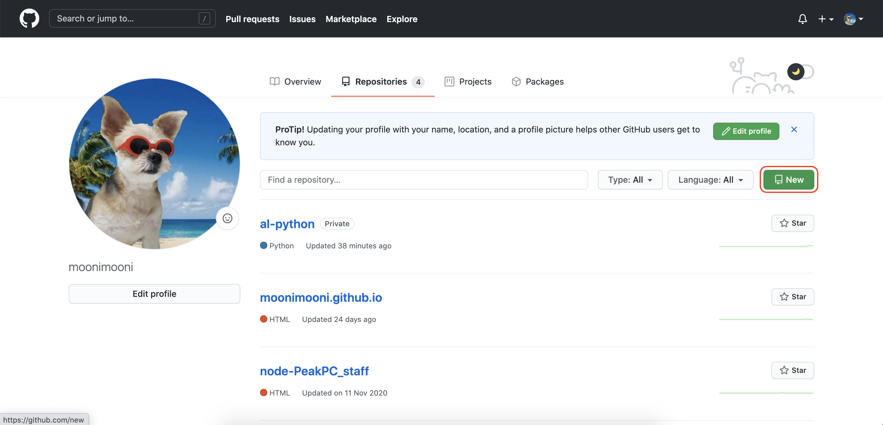 본인 계정으로 접속한 뒤 repositories 부분에서 new 라는 버튼을 클릭합니다.