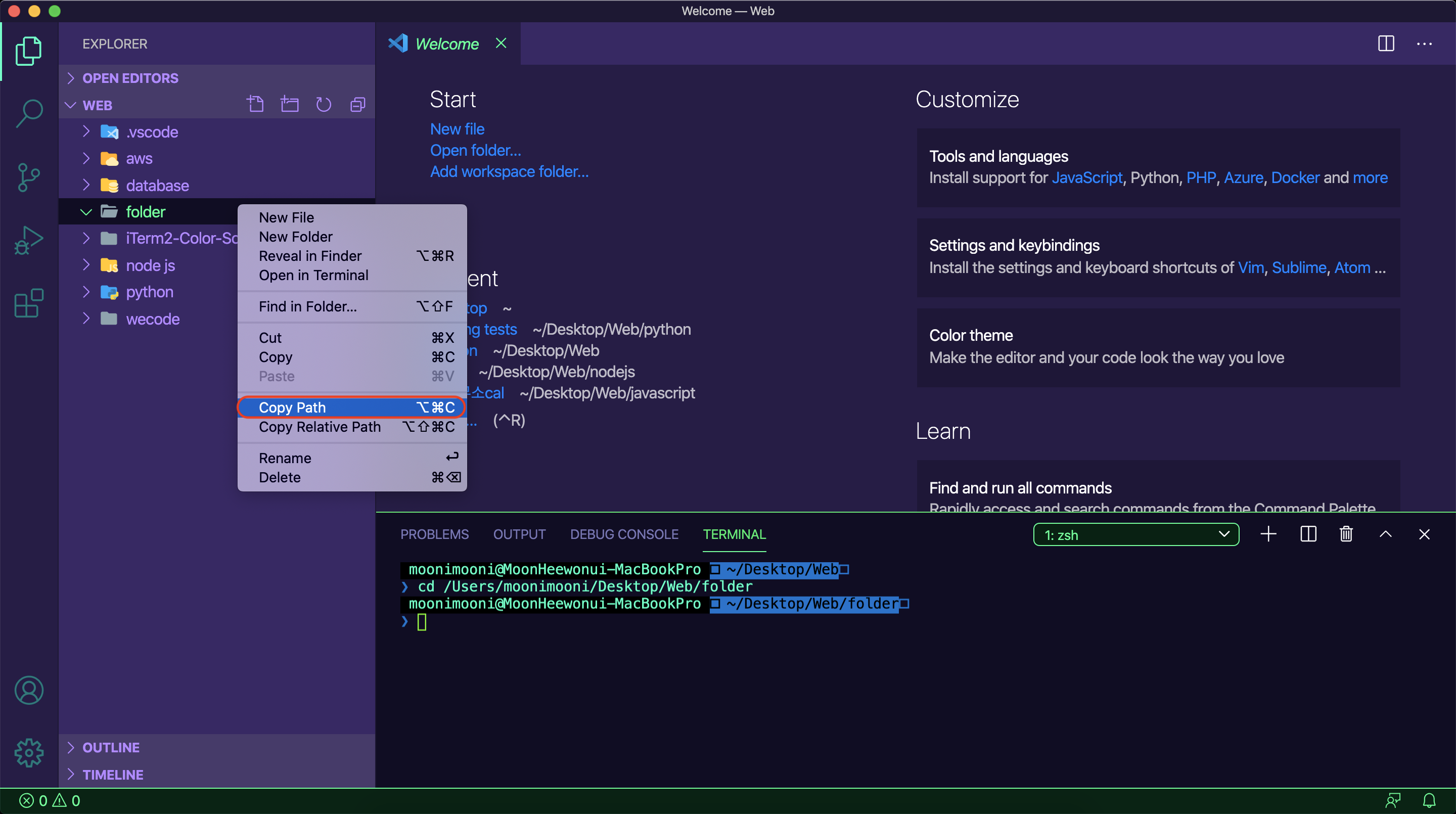 왼쪽 explorer 메뉴에서 해당 폴더를 우클릭하면 Copy Path기능이 뜹니다.