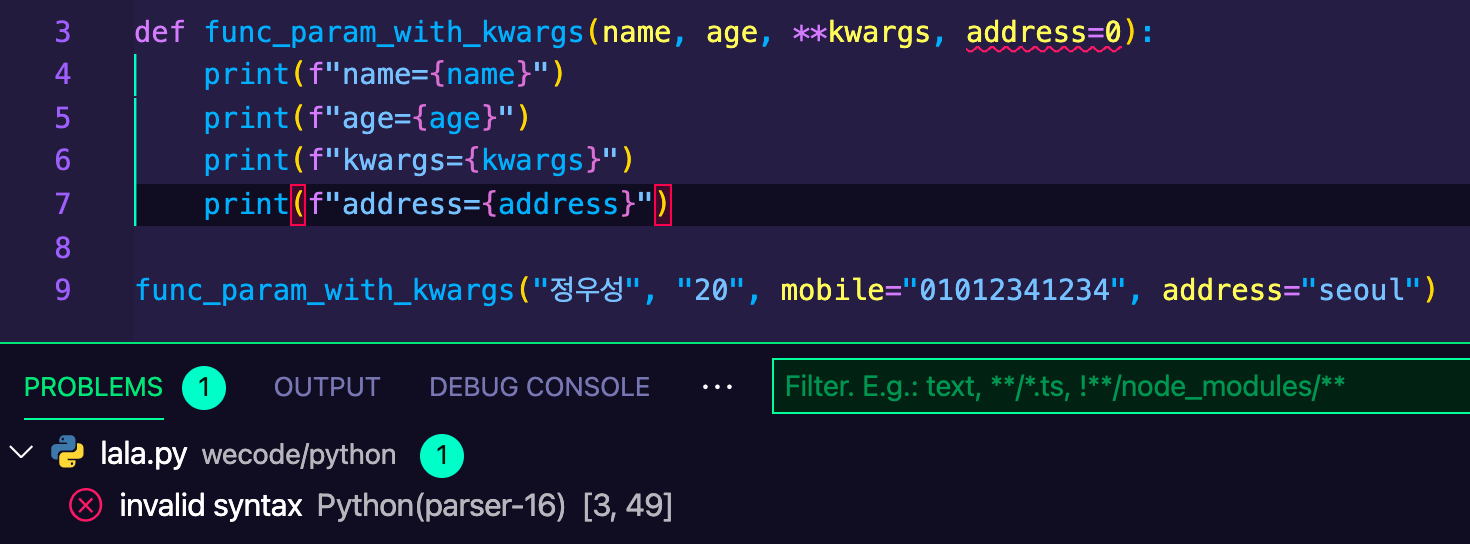 default value parameter는 *args가 아니라 **kwargs에 포함되기 때문입니다.