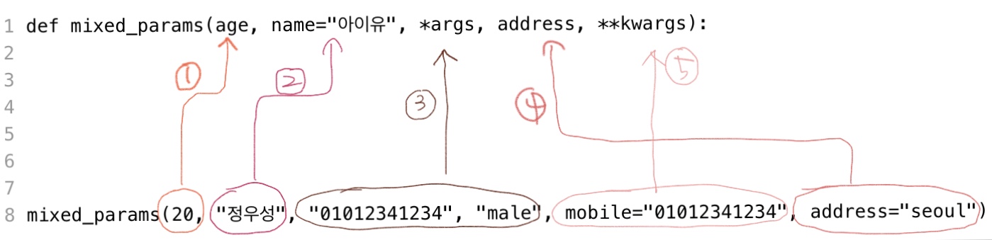 def mixed_params(age, name="아이유", *args, address, **kwargs):