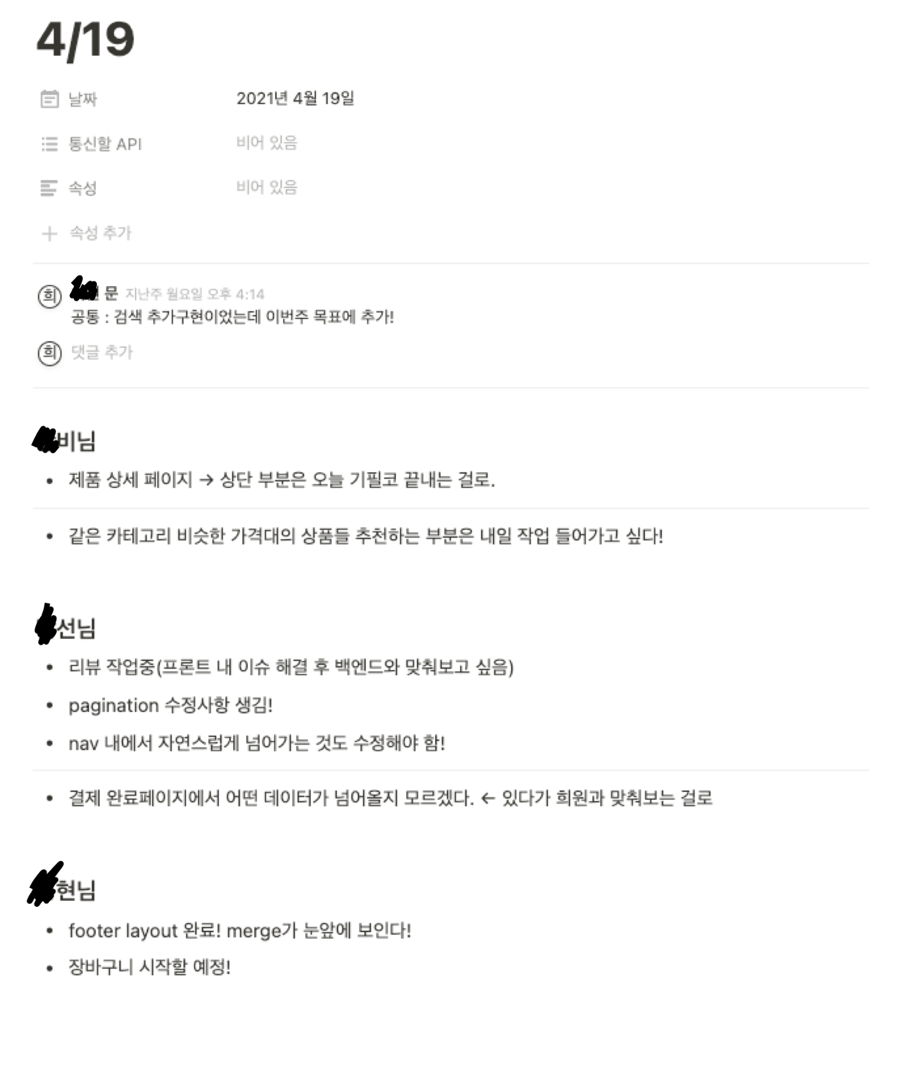 프론트엔드 분들도 특정 페이지 기능 작업에 들어가면 백엔드에게 알려주었죠.