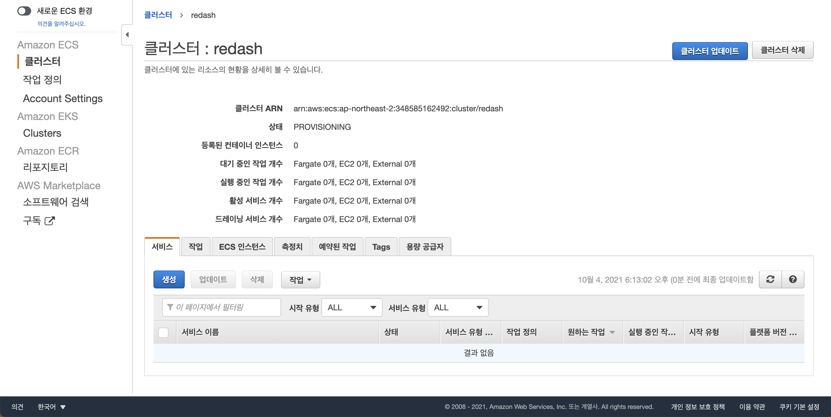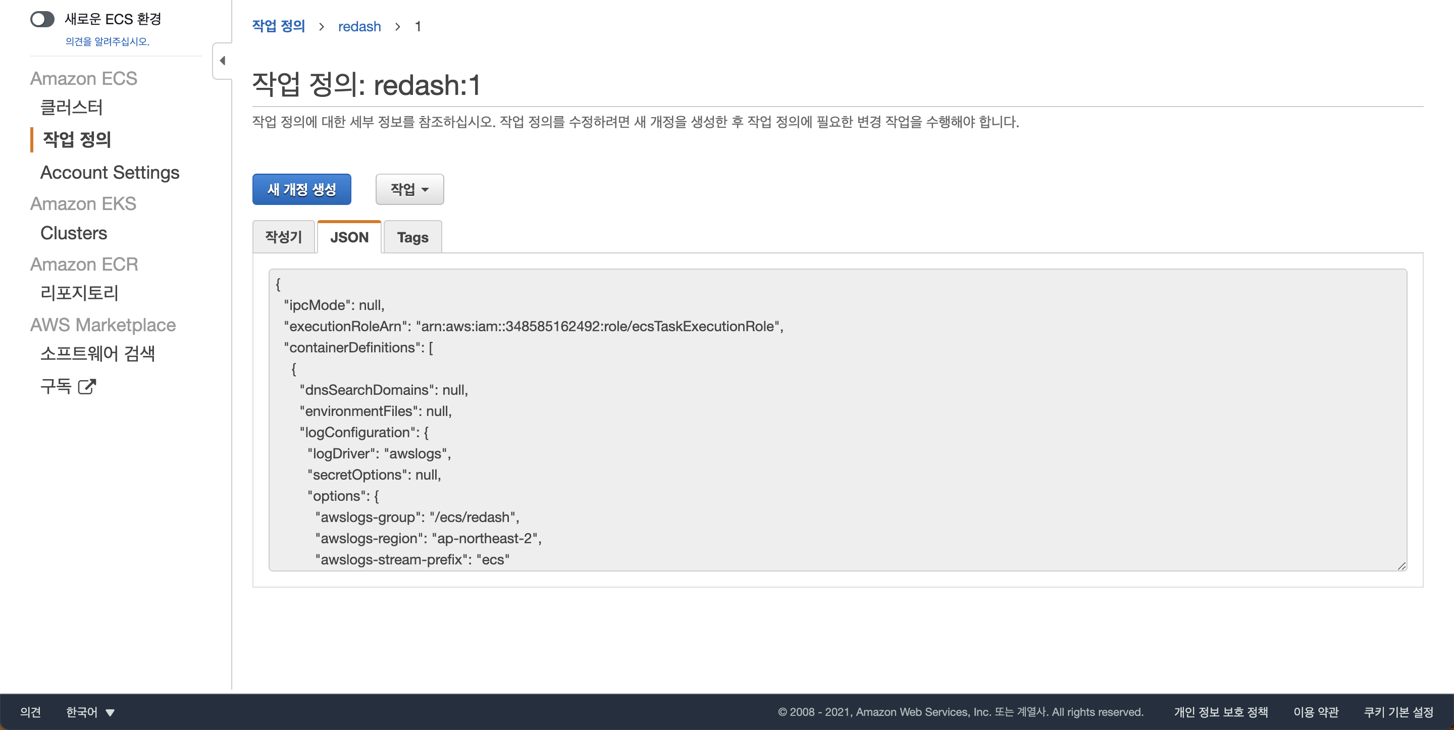 완료를 누르면 redash:1 이라는 이름으로 작업 정의가 생성됩니다.