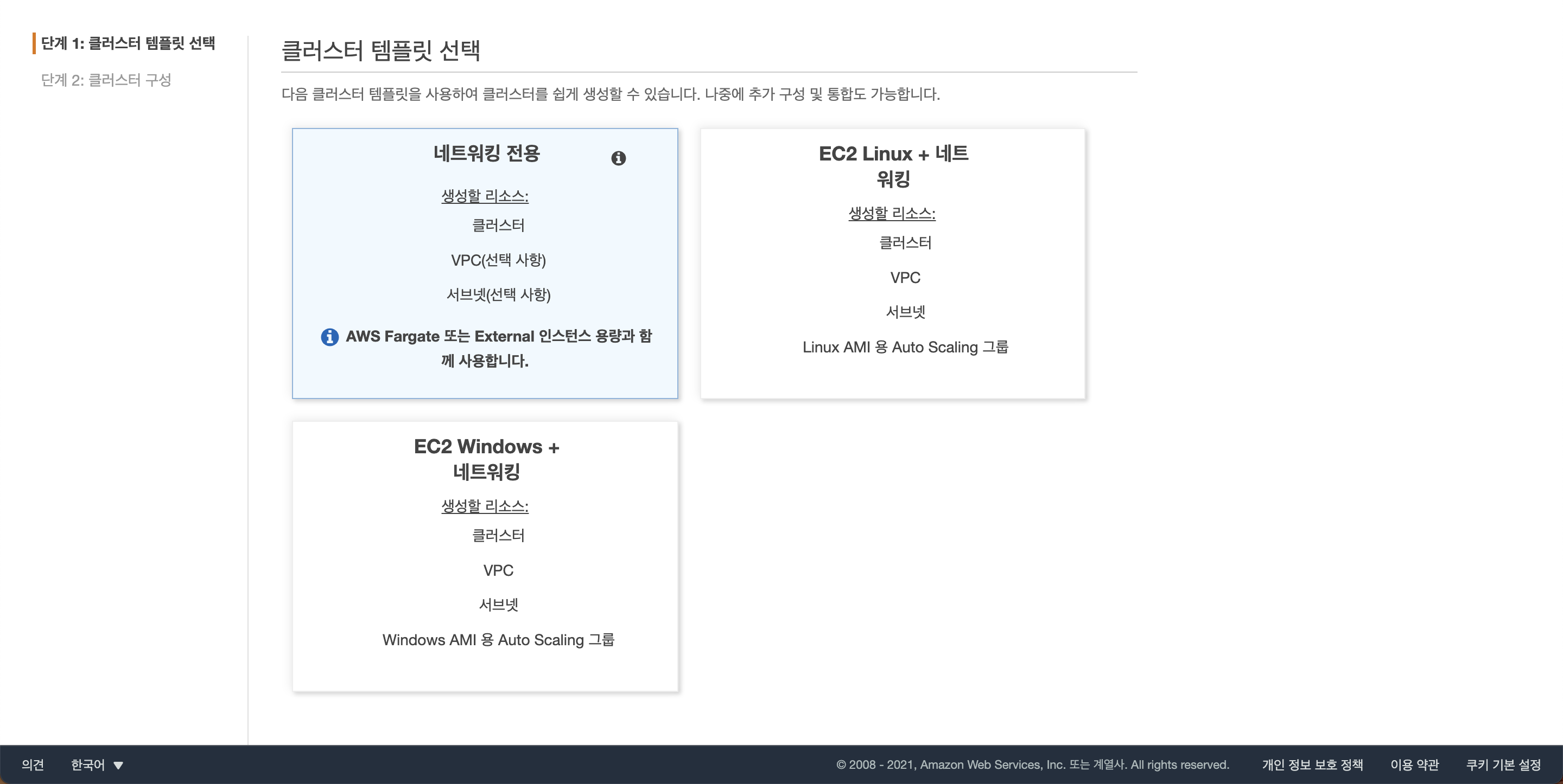 저희는 Fargate 기반의 서비스를 띄울 것이니 네트워킹 전용 옵션을 누르면 끝.