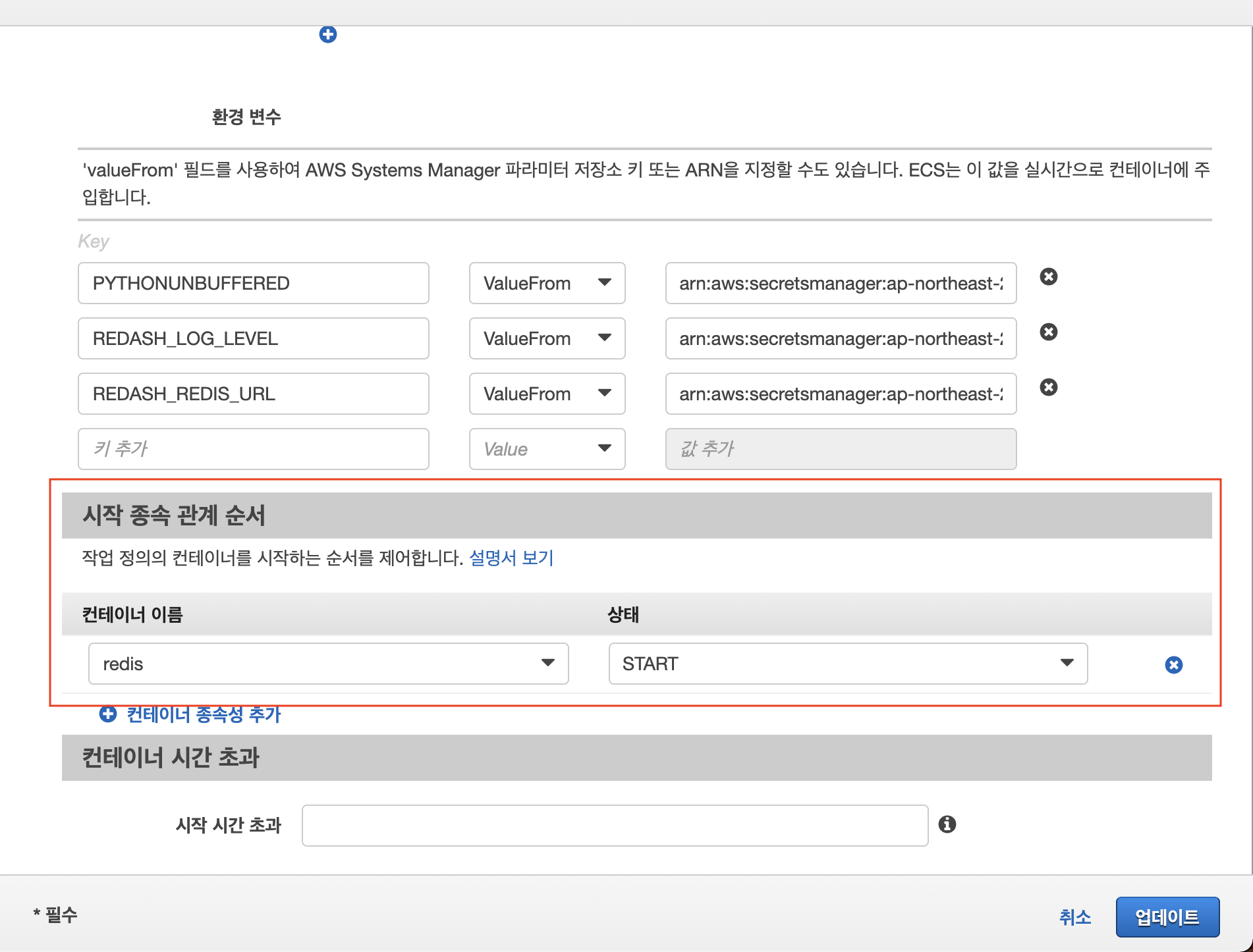 이는 server라는 프로그램이 실행되기 전 redis와 postgres가 실행되어야 함을 의미합니다. 따라서 지금 작성하고 있는 server container definitions는 redis container definitions가 먼저 작성되어야 완성됩니다. (postgres는 rds니까 패스)