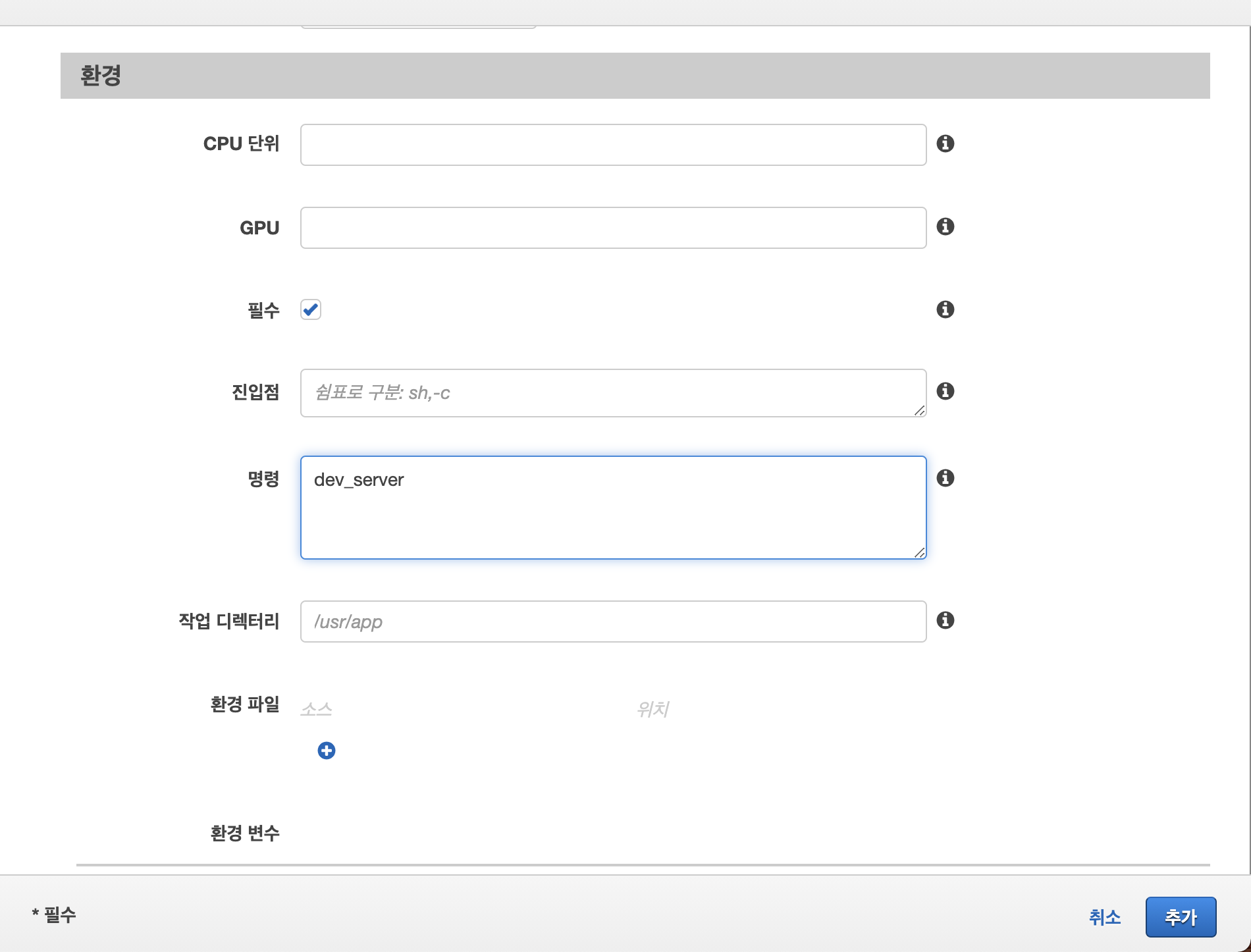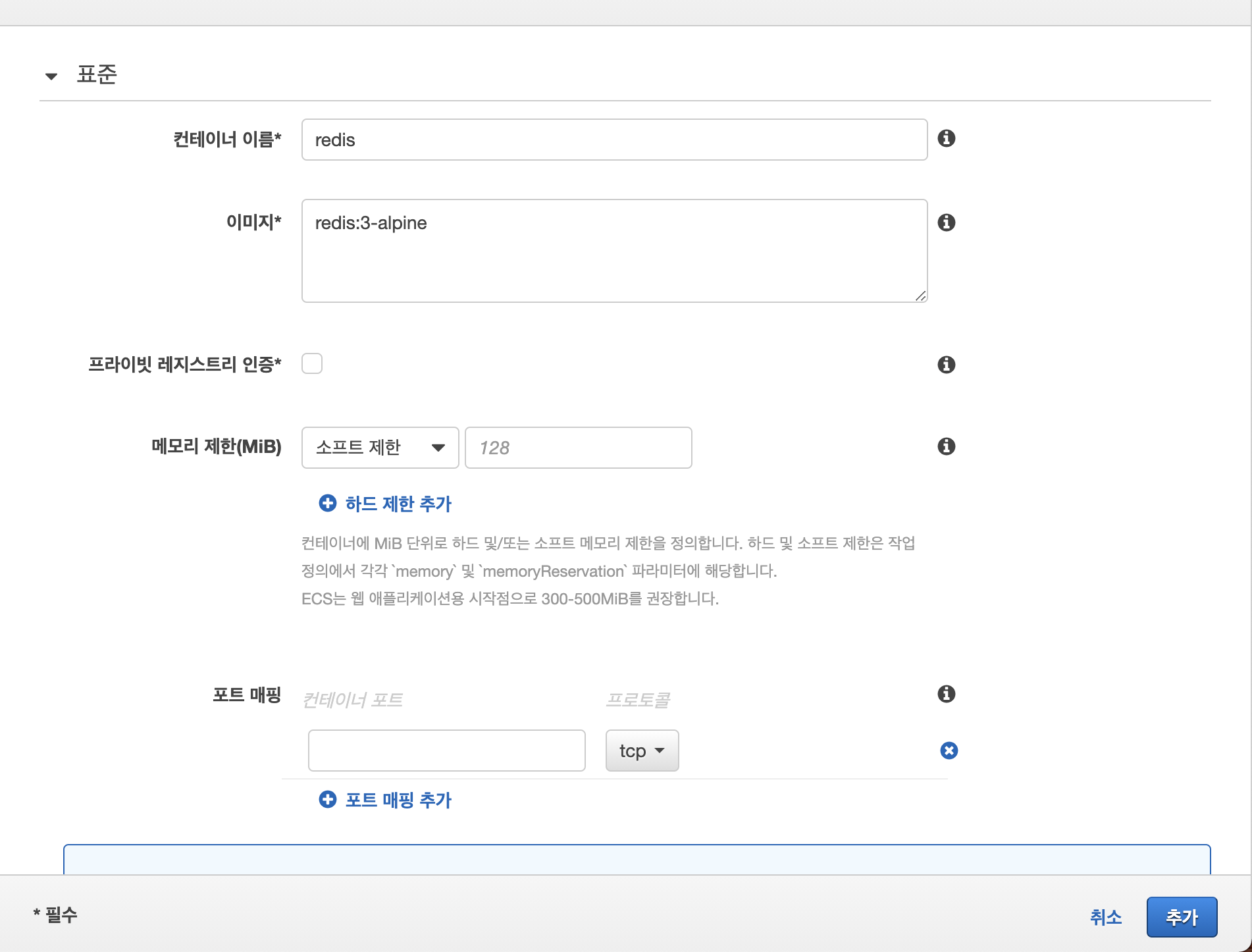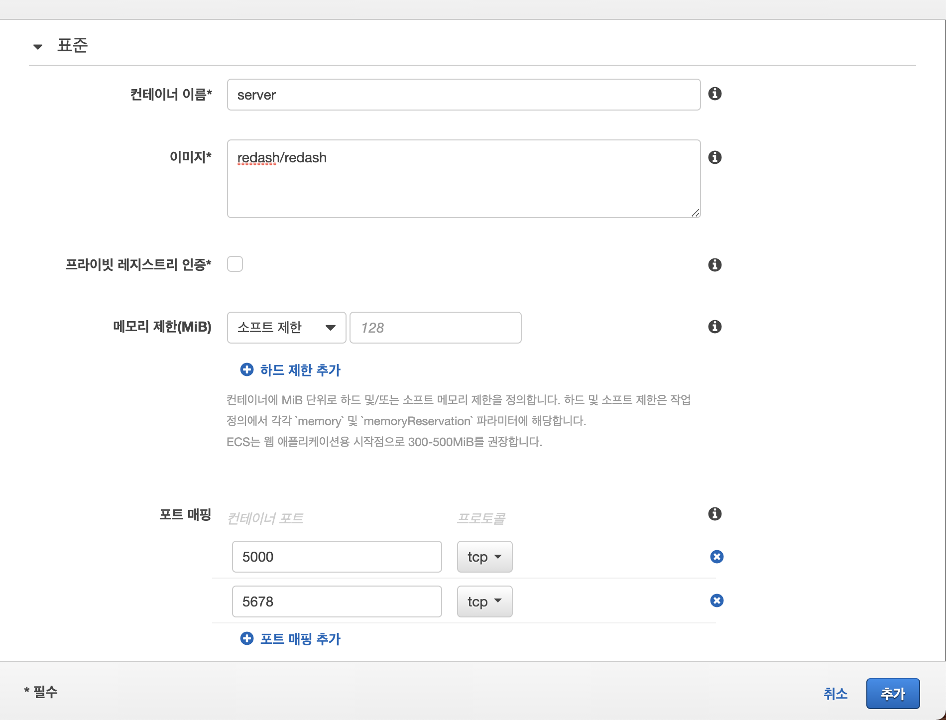 그리고 다시 컨테이너 정의로 돌아와서, 아래와 같이 기입해주면 됩니다.