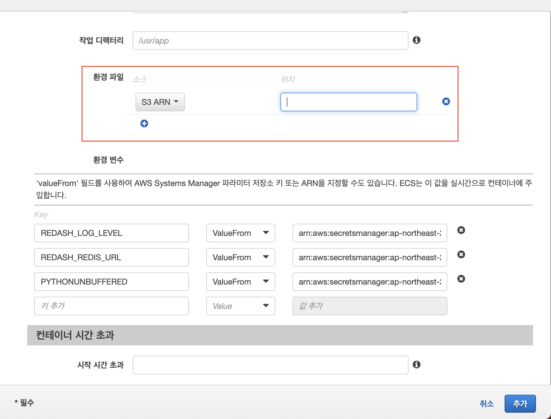 마찬가지로 env파일을 저장하고 있는 S3 ARN을 붙여넣는 방식으로 사용할 수 있습니다.