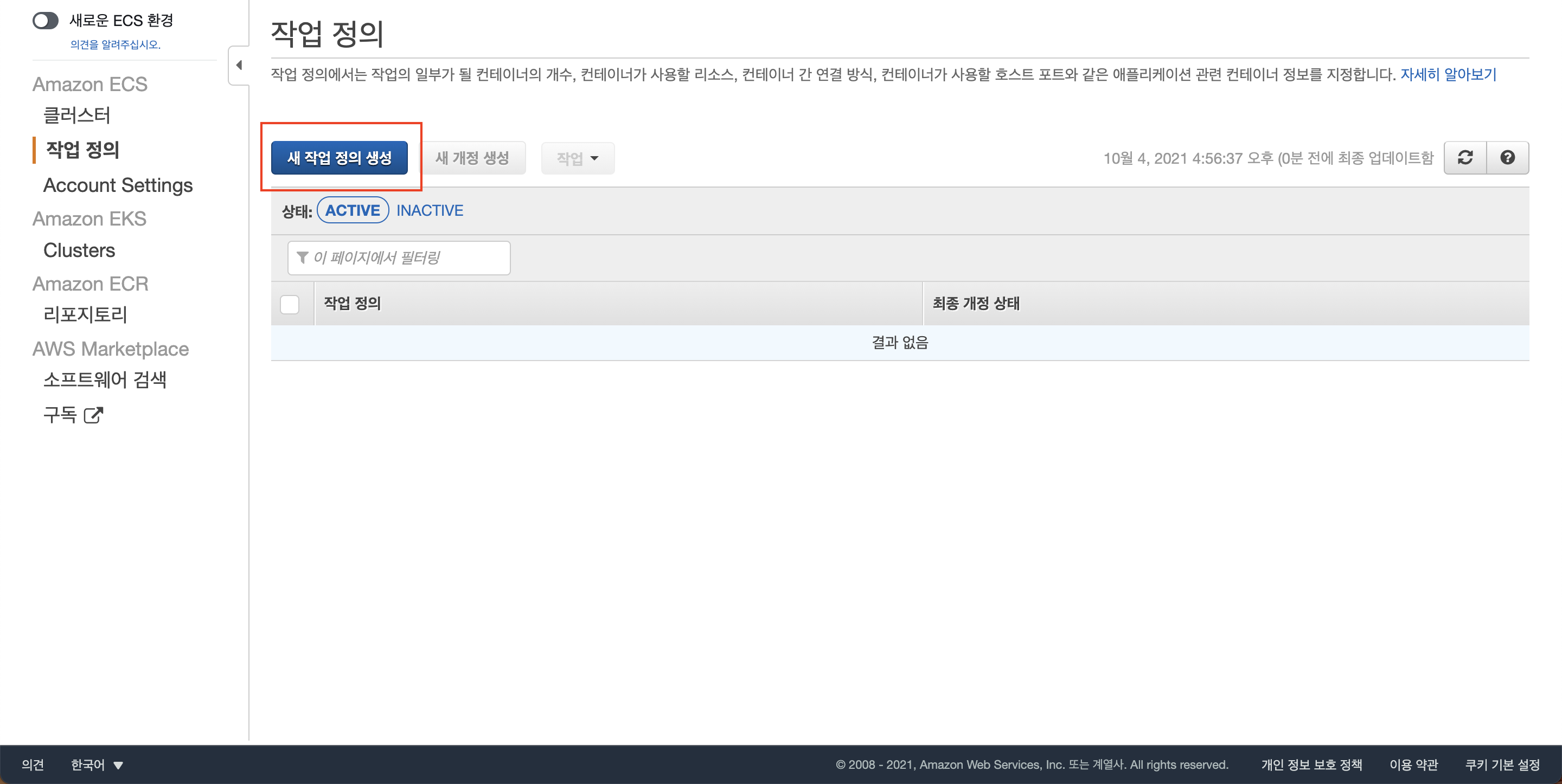 왼쪽 사이드 메뉴를 보면 클러스터 바로 아래 작업 정의가 있네요.