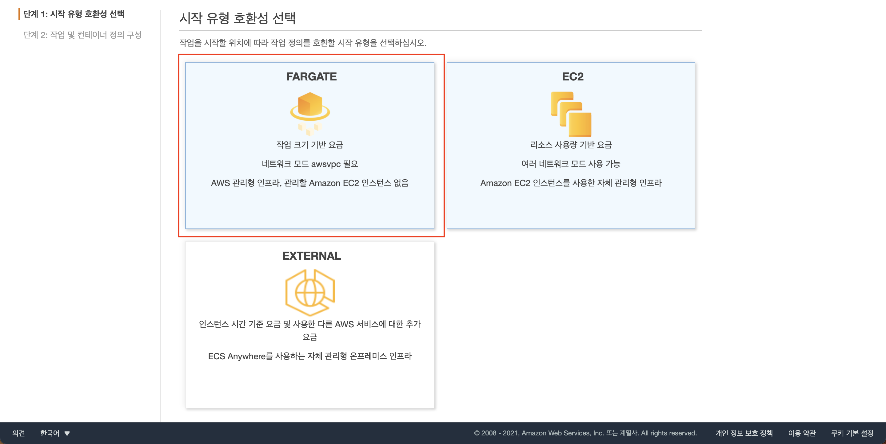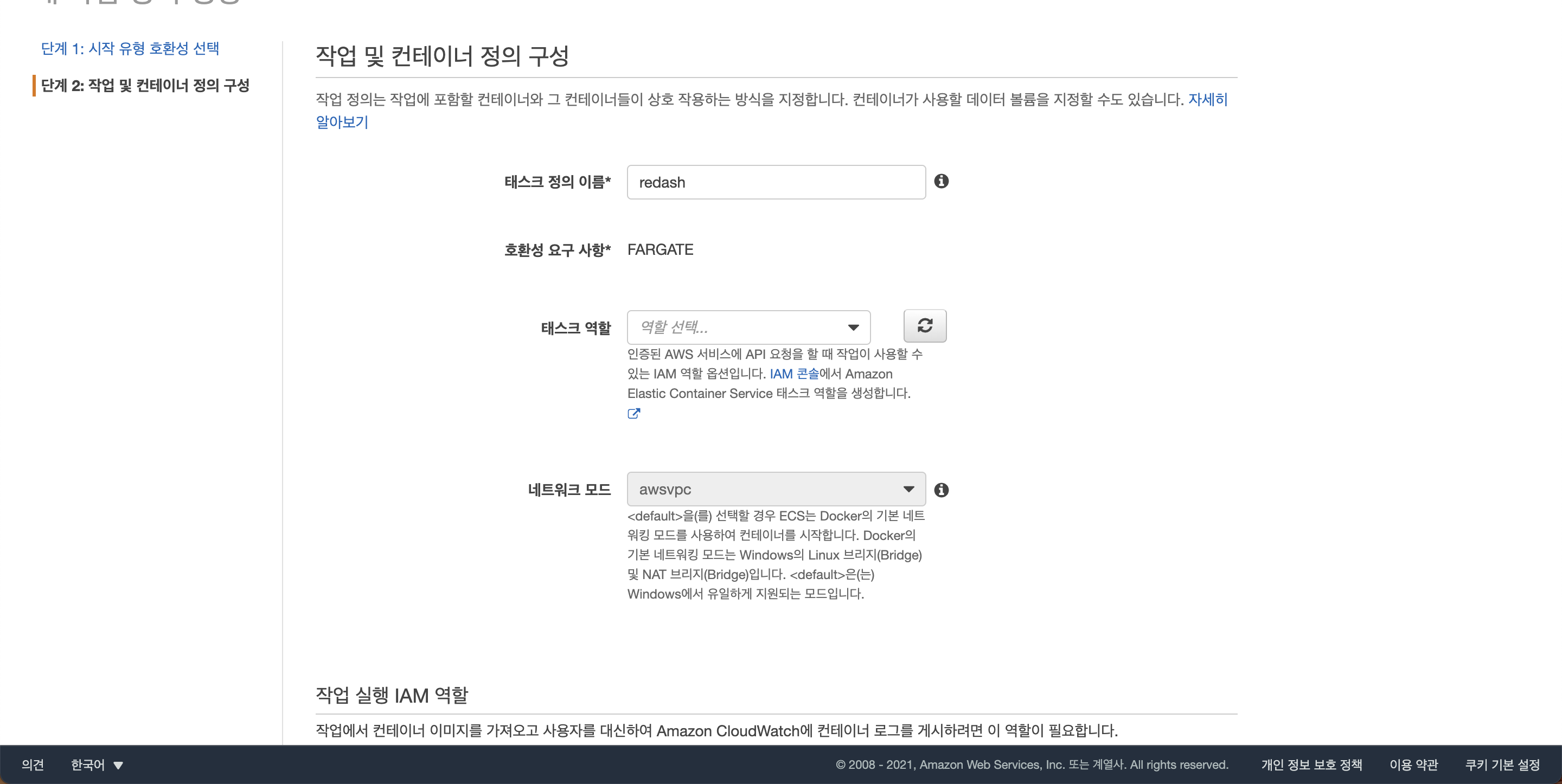 저는 현재 root 계정으로 테스트 작업중이라 태스크 역할을 패스했는데, IAM 계정이라면 다를 수 있습니다.