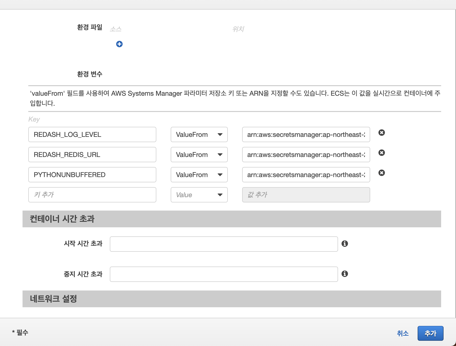 이제 환경 변수를 설정해줄 차례입니다. 편하게 key: value를 그냥 적어놓으면 편하겠지만.. 이런 방법은 AWS에서도 권장하는 방법은 아니며 (당연한 말이지만, 보안 문제 때문에...), 안전하게 환경변수를 컨테이너로 전달해주기 위해 우리는 세 가지 방법을 사용할 수 있습니다.