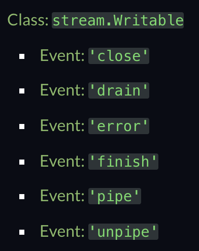 이벤트의 종류도 writable stream이냐 readable stream이냐에 따라 각기 다릅니다. 자세한건 공식문서를 참고하세요!