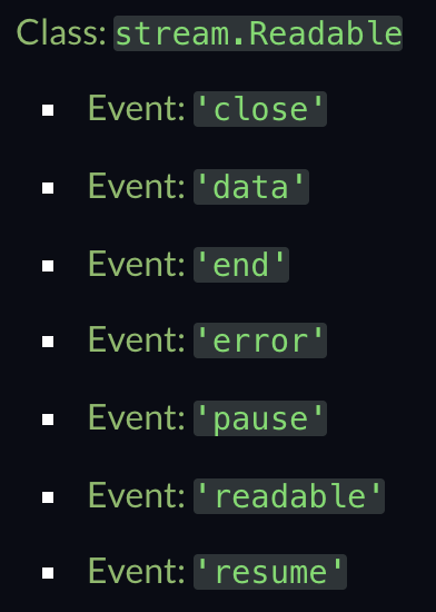 이벤트의 종류도 writable stream이냐 readable stream이냐에 따라 각기 다릅니다. 자세한건 공식문서를 참고하세요!