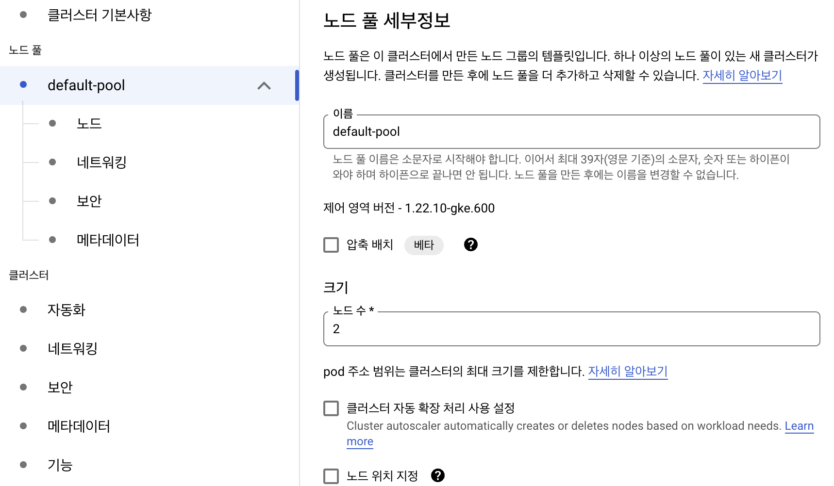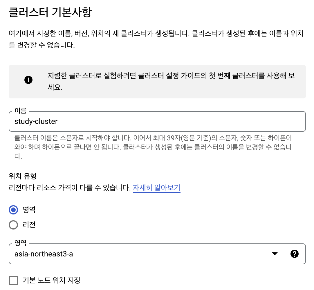 위치유형은 영역 / 리전 두 옵션이 있는데, 영역을 선택하면 asia-northeast3-a에만 노드가 생성이 되고, 리전을 선택하면 asia-northeast3에 해당하는 모든 영역 (asia-northeast3-a, asia-northeast3-b, asia-northeast3-c) 에 노드가 생성됩니다. 이를 방지하려면 "기본 노드 위치 지정" 옵션을 사용하시면 됩니다.